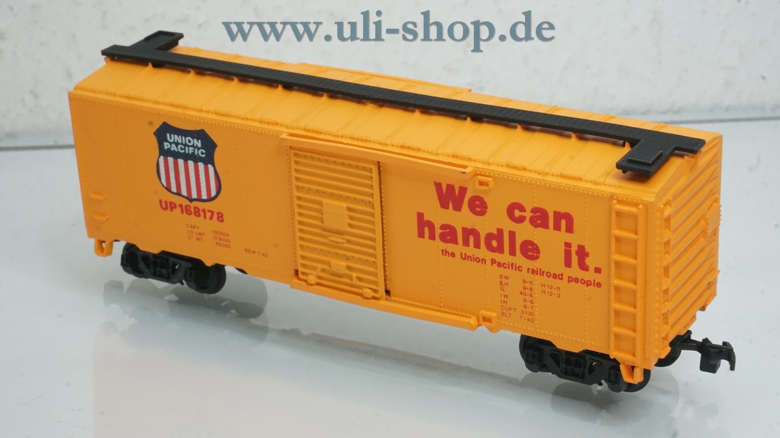 Bachmann H0 Güterwagen mit der Artikelnummer 70000 Steel Box Car der Union Pacific. Der Artikel ist für den Betrieb mit Gleichstrom vorgesehen. Die Originalverpackung ist vorhanden.