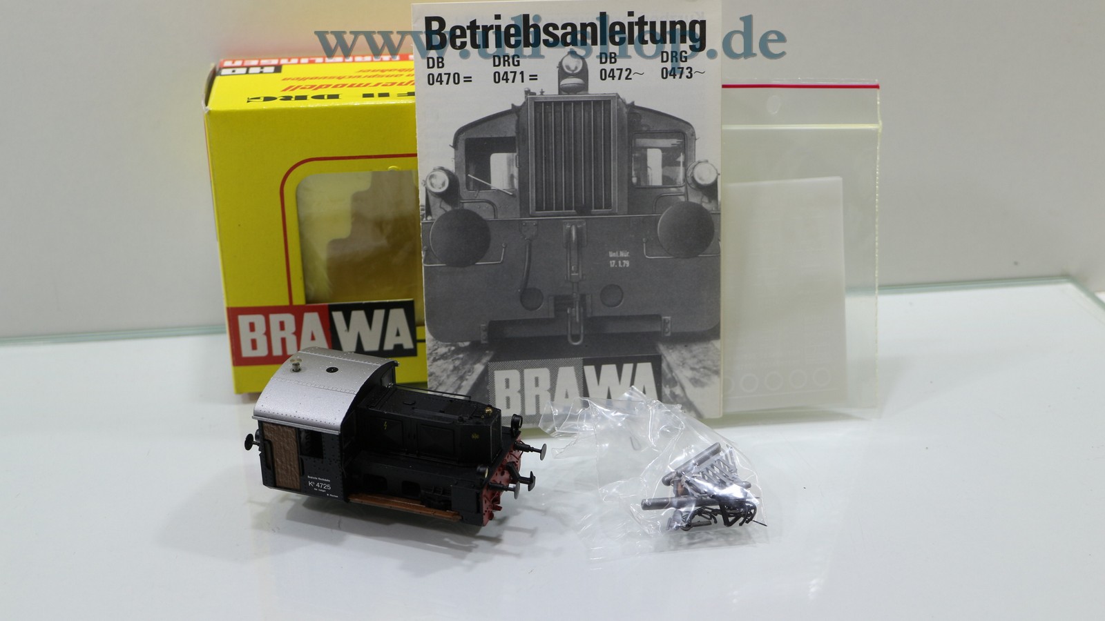 Brawa H0 Diesellok mit der Artikelnummer 0473 Köf II 4725 der DRG. Der Artikel ist für den Betrieb mit Wechselstrom vorgesehen. Die Lok ist analog, sie kann daher nicht auf digital gesteuerten Anlagen fahren. Die Originalverpackung ist vorhanden.