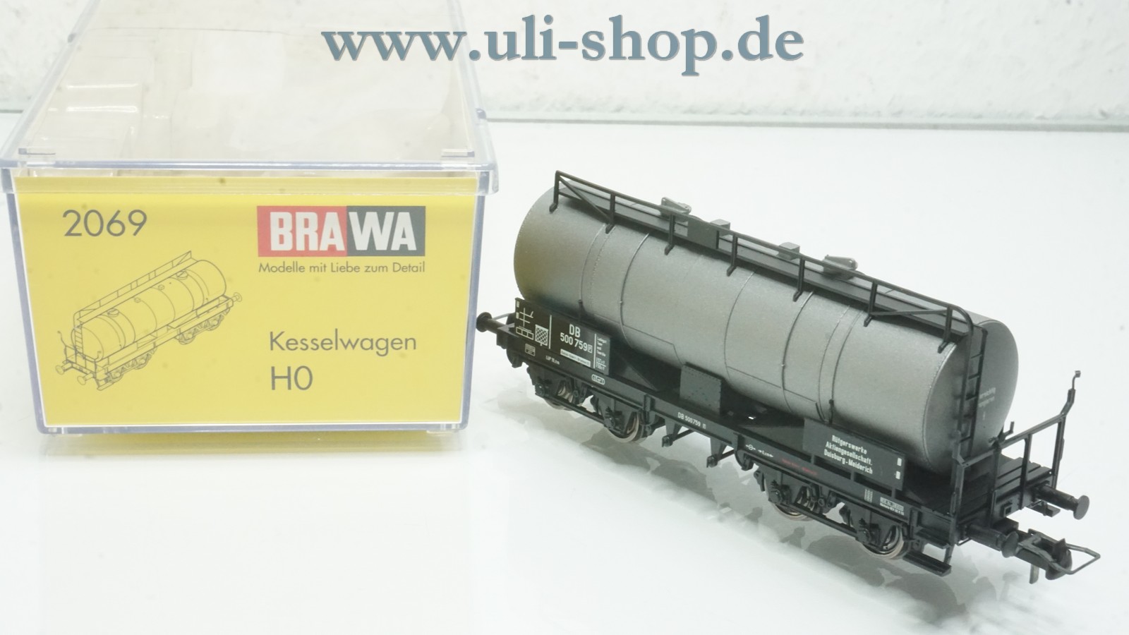 Brawa H0 Güterwagen mit der Artikelnummer 2069 Kesselwagen Rütgerswerke der DB. Der Artikel ist für den Betrieb mit Gleichstrom vorgesehen. Die Originalverpackung ist vorhanden.