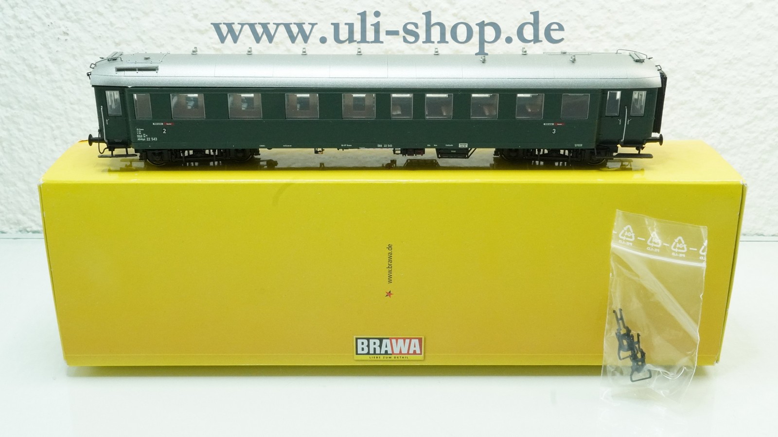 Brawa H0 Personenwagen mit der Artikelnummer 46165 Eilzugwagen der ÖBB. Der Artikel ist für den Betrieb mit Gleichstrom vorgesehen. Die Originalverpackung ist leider nicht mehr vorhanden. Der Wagen hat auf einer Seite ein eingezogenes Faltenbalg (für Schlußwagen) verbaut. Es ist kein anderes Faltrenbalg zum tauschen dabei.