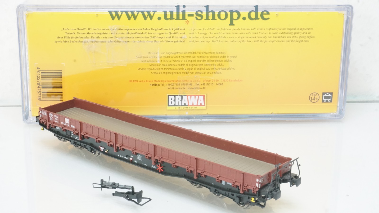 Brawa H0 Güterwagen mit der Artikelnummer 47577 Schwerlastwagen Rrym 60 der DR. Der Artikel ist für den Betrieb mit Wechselstrom vorgesehen. Die Originalverpackung ist vorhanden.