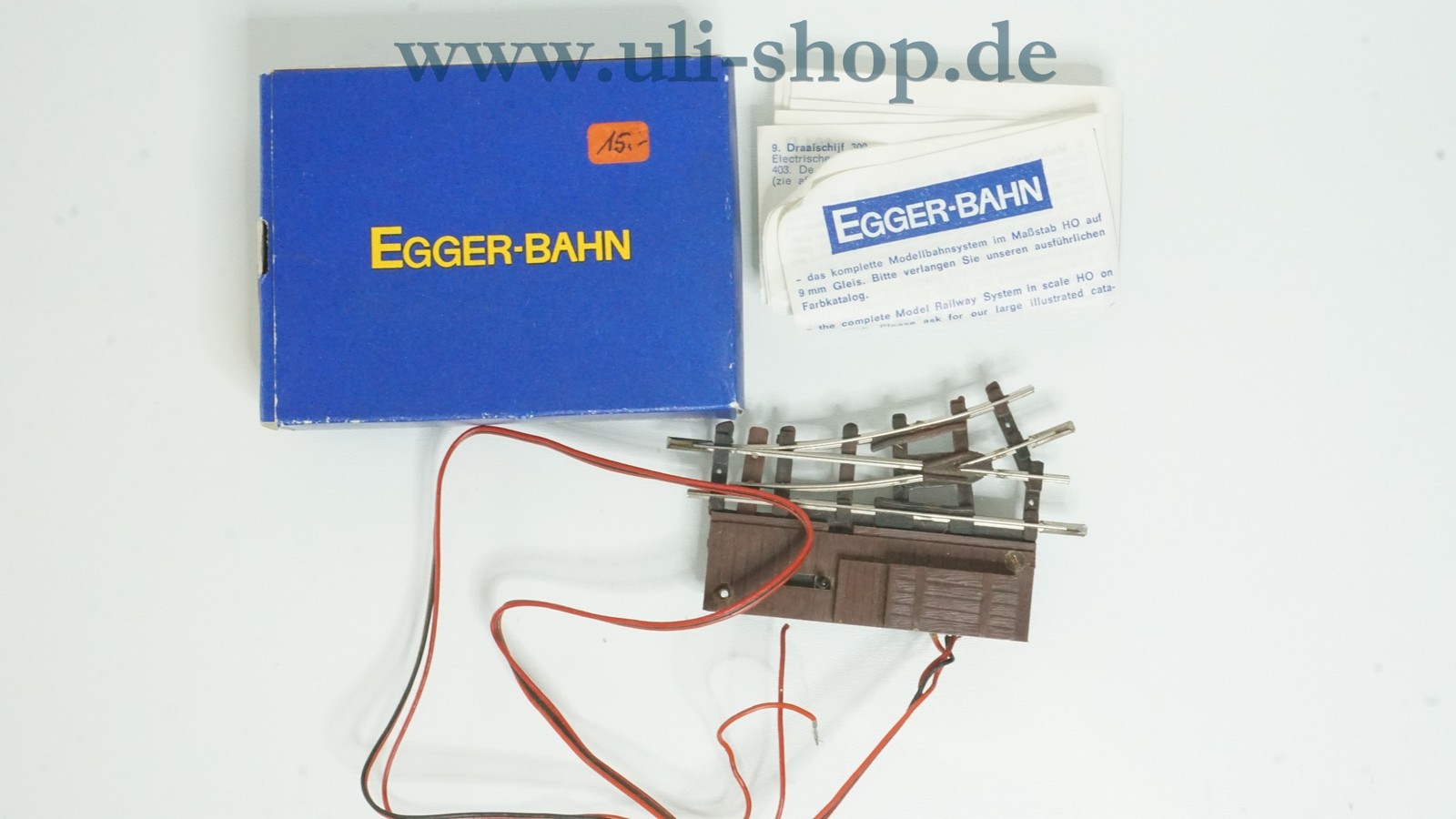 Egger H0e Gleismaterial mit der Artikelnummer 3602 elektrische Weiche links. Der Artikel ist für den Betrieb mit Gleichstrom vorgesehen. Die Originalverpackung ist vorhanden. Die Spurweite entspricht 9mm (Spur N). Am Antrieb fehlt eine Befestigungsschraube.