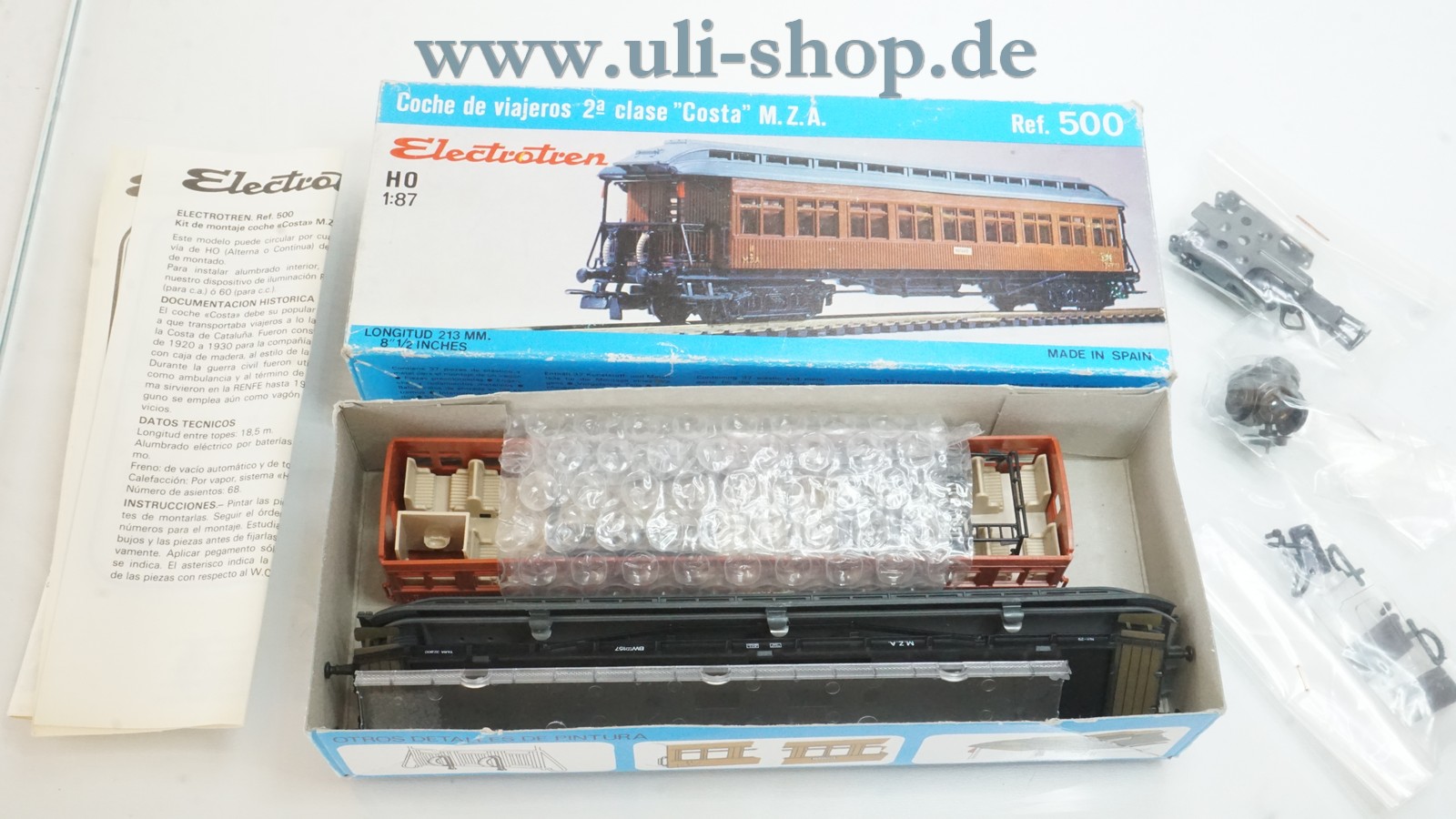 Electrotren H0 Personenwagen mit der Artikelnummer 500 Bausatz Coche de viajeros 2s clase "Costa" M.Z.A. Der Artikel ist für den Betrieb mit Gleichstrom vorgesehen. Die Originalverpackung ist vorhanden.
