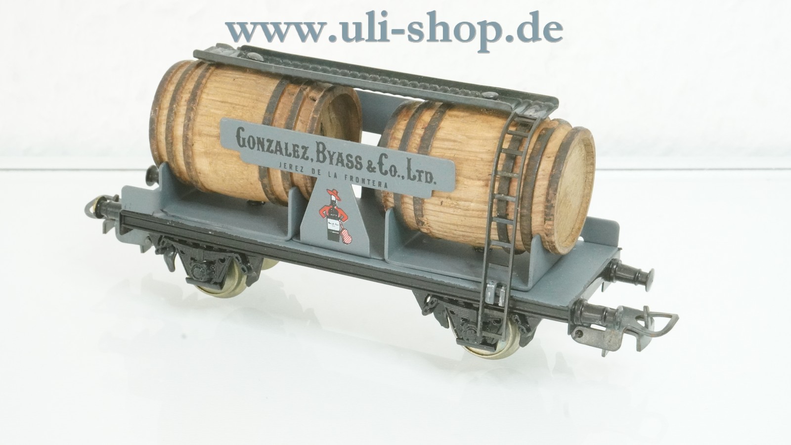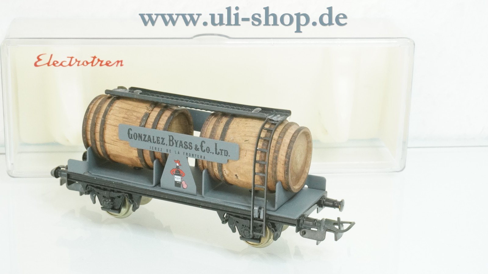 Electrotren H0 Güterwagen mit der Artikelnummer 800 Weinfasswagen Gonzalez Byass ohne Bremserhaus. Der Artikel ist für den Betrieb mit Gleichstrom vorgesehen. Die Originalverpackung ist vorhanden.