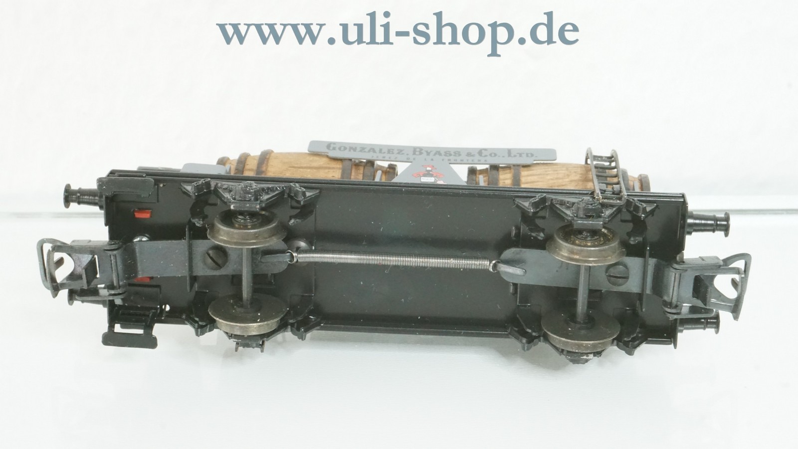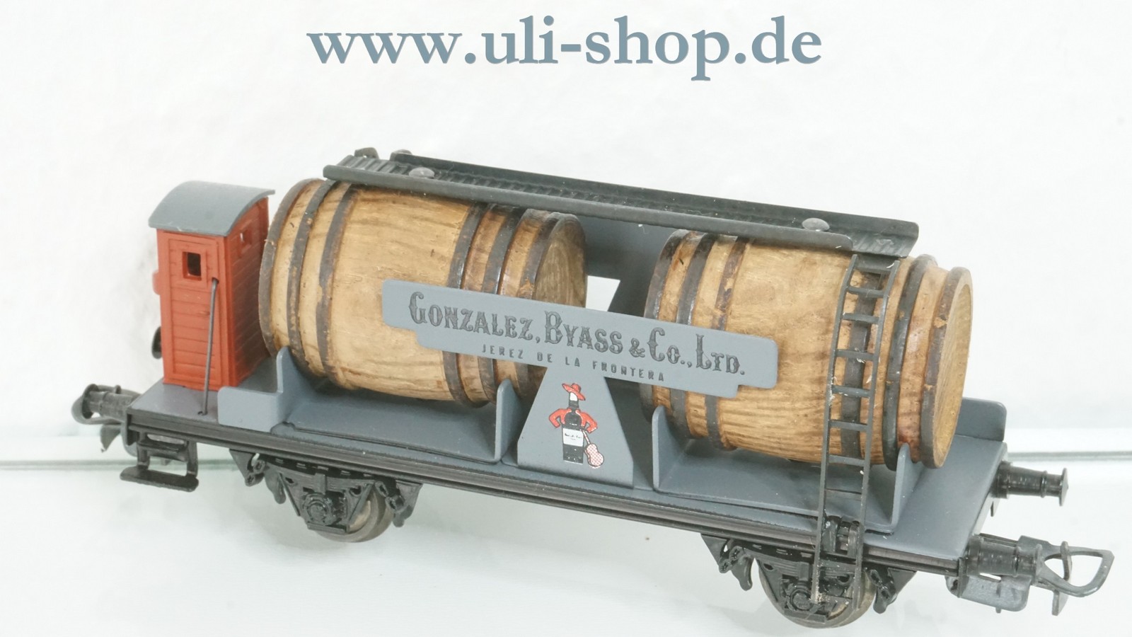 Electrotren H0 Güterwagen mit der Artikelnummer 801 Weinfasswagen Gonzalez Byass mit Bremserhaus. Der Artikel ist für den Betrieb mit Gleichstrom vorgesehen. Die Originalverpackung ist vorhanden.
