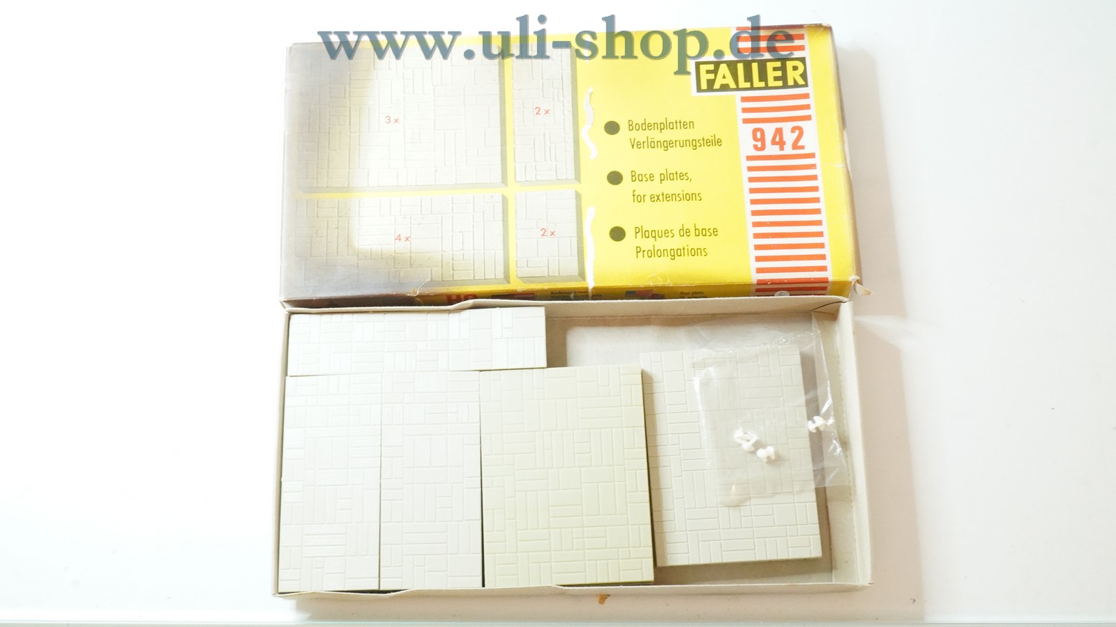 Faller AMS H0 mit der Artikelnummer 942 Bodenplatten Verlängerungsteile. Die Originalverpackung ist vorhanden. Die beiliegenden Verbindungsstifte sind nicht vollständig.