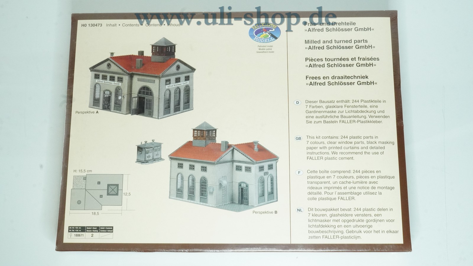 Faller H0 Modellhaus mit der Artikelnummer 130473 Fräs- und Drehteile "Alfred Schlösser GmbH". Die Originalverpackung ist vorhanden.