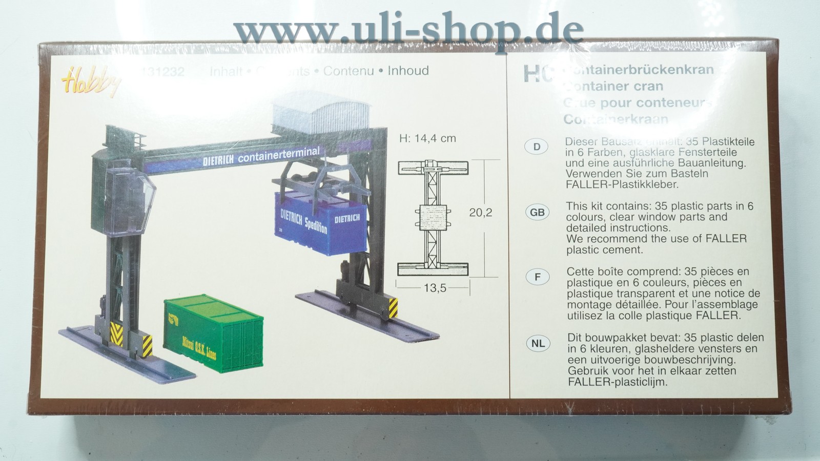 Faller H0 Modellhaus mit der Artikelnummer 131232 Containerbrückenkran. Die Originalverpackung ist vorhanden.