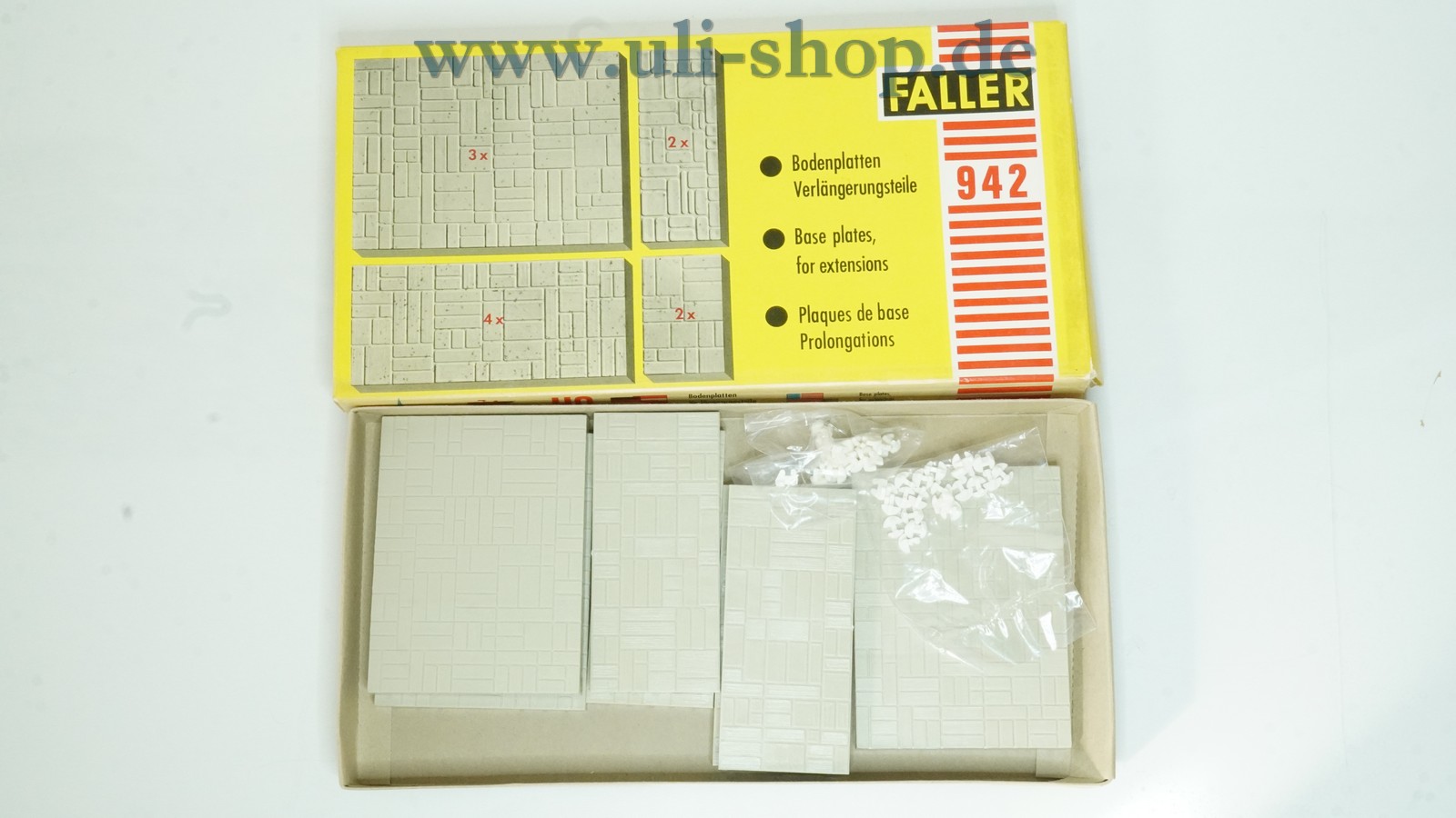 Faller H0 Modellhaus mit der Artikelnummer 942 Bodenplatten Verlängerungsteile. Die Originalverpackung ist vorhanden. Die Verpackung des Bausatzes wurde schon einmal geöffnet. Wir können leider nicht mit Sicherheit behaupten, dass alle Teile vollständig vorhanden sind, es sieht aber danach aus. Sollte sich beim Zusammenbauen herausstellen, dass doch Teile fehlen, werden wir Ihnen den Kaufbetrag selbstverständlich zurückerstatten.