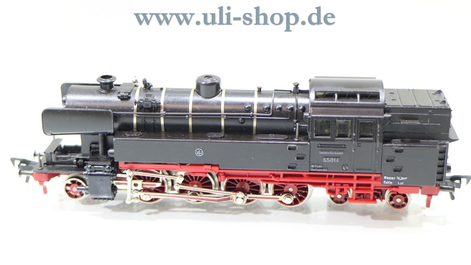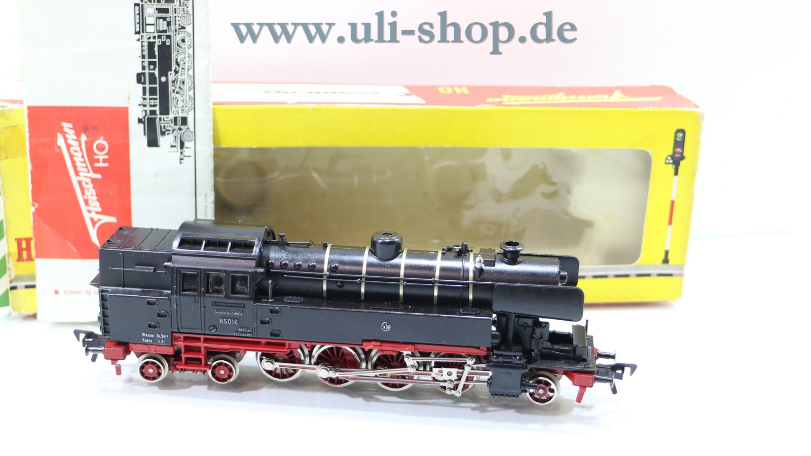 Fleischmann H0 Dampflok mit der Artikelnummer 1324 Br. 65 014 der DB . Der Artikel ist für den Betrieb mit Gleichstrom vorgesehen. Die Lok ist analog, sie kann daher nicht auf digital gesteuerten Anlagen fahren. Die Originalverpackung ist vorhanden.