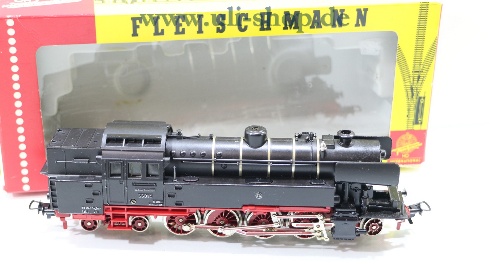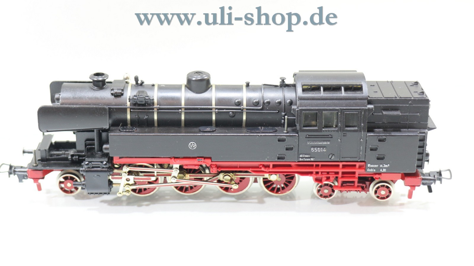Fleischmann H0 Dampflok mit der Artikelnummer 1324 Br. 65 014 der DB . Der Artikel ist für den Betrieb mit Gleichstrom vorgesehen. Die Lok ist analog, sie kann daher nicht auf digital gesteuerten Anlagen fahren. Die Originalverpackung ist vorhanden.