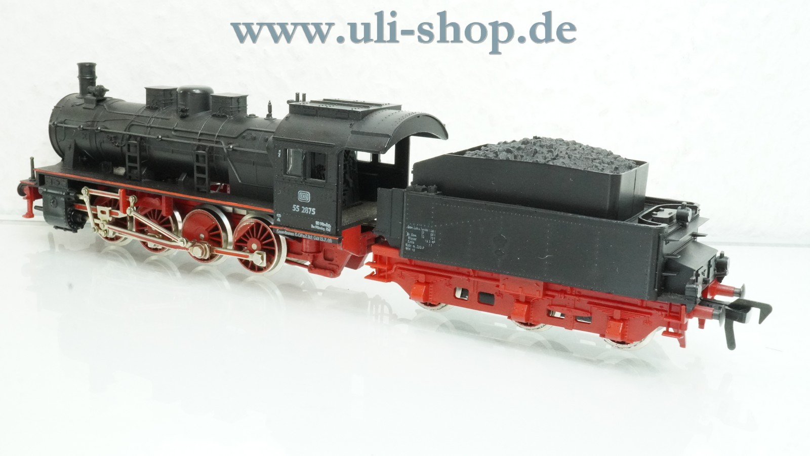 Fleischmann H0 Dampflok mit der Artikelnummer 1351 Br. 55 2875 der DB. Der Artikel ist für den Betrieb mit Gleichstrom vorgesehen. Die Lok ist analog, sie kann daher nicht auf digital gesteuerten Anlagen fahren. Die Originalverpackung ist leider nicht mehr vorhanden.