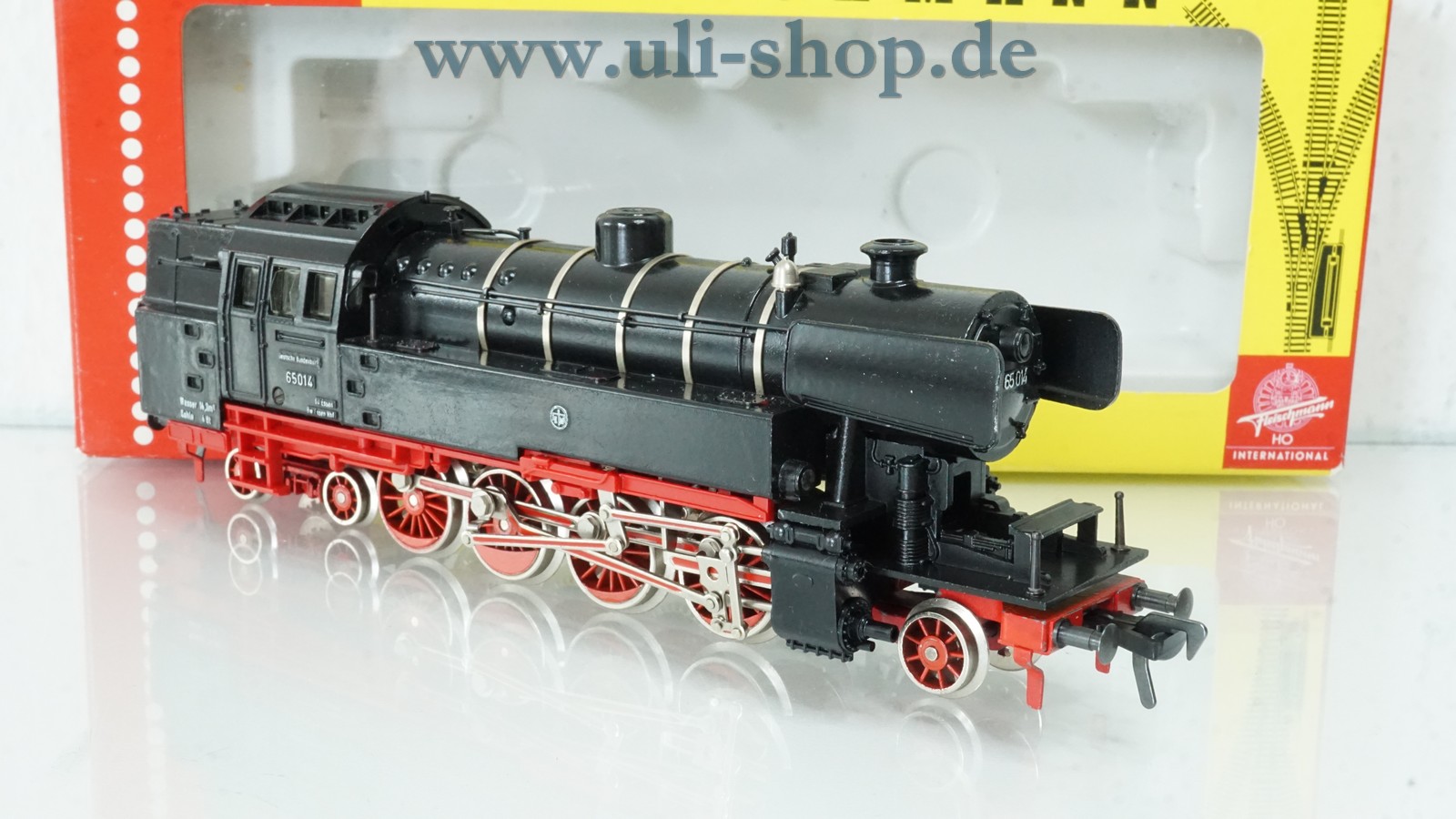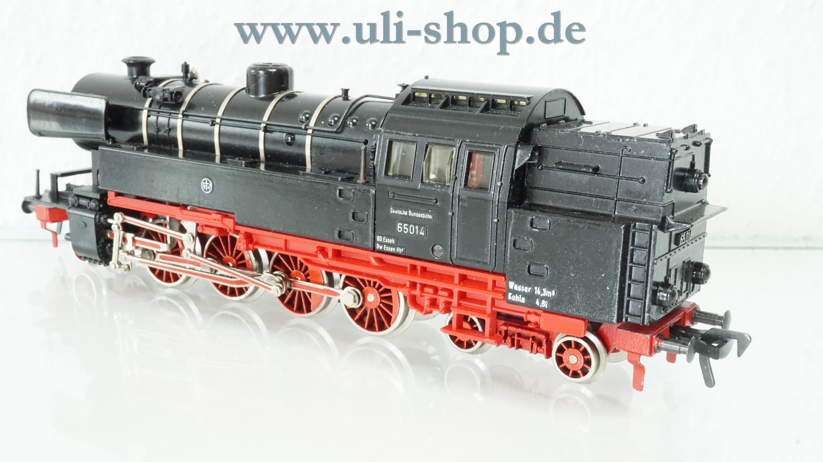 Fleischmann H0 Dampflok mit der Artikelnummer 4080 Br. 65 014 der DB. Der Artikel ist für den Betrieb mit Gleichstrom vorgesehen. Die Lok ist analog, sie kann daher nicht auf digital gesteuerten Anlagen fahren. Die Originalverpackung ist vorhanden.