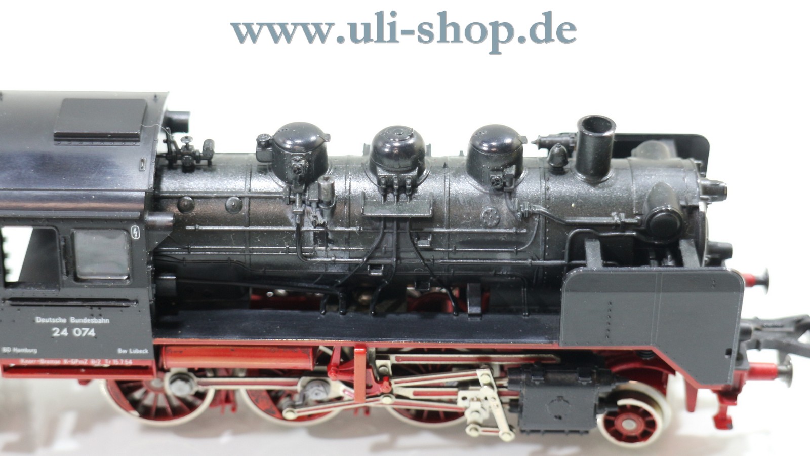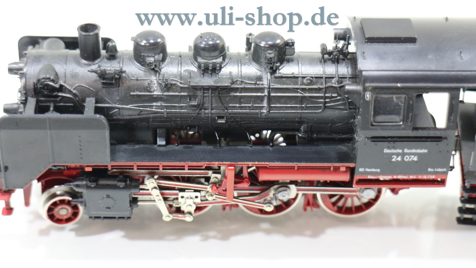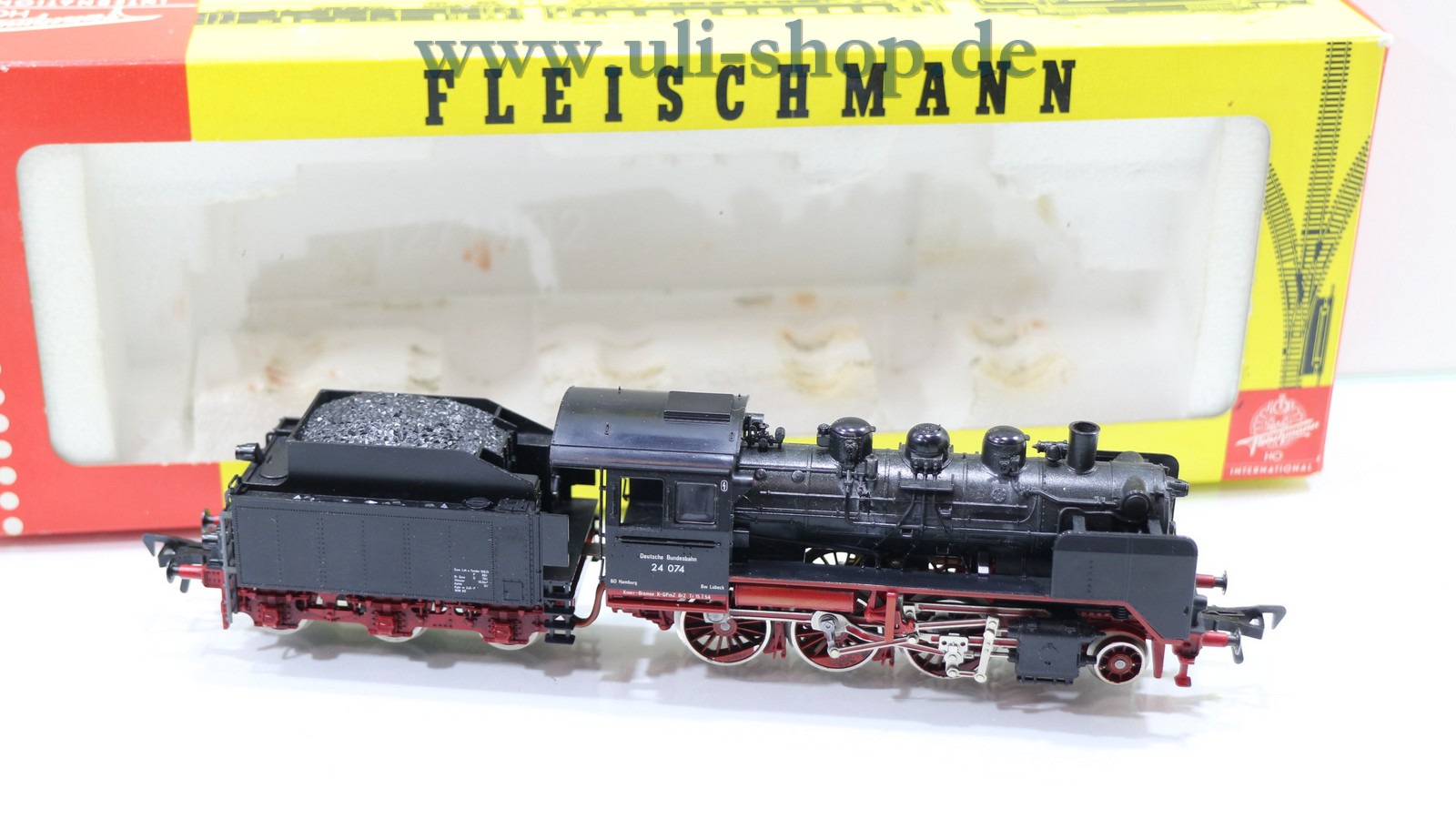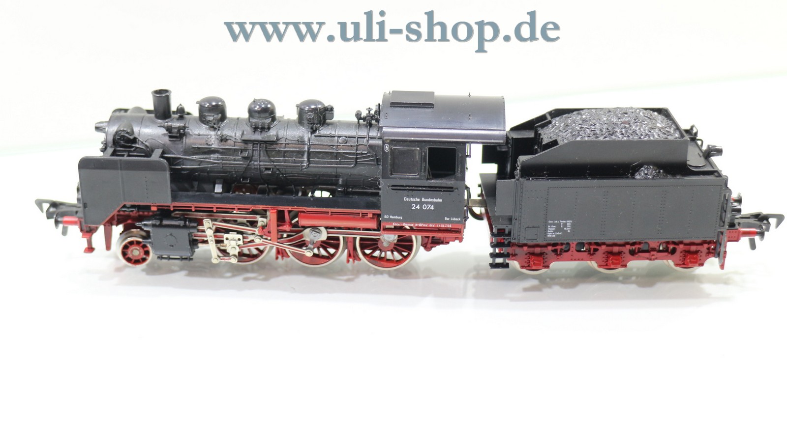 Fleischmann H0 Dampflok mit der Artikelnummer 4140 Br. 24 074 der DB. Der Artikel ist für den Betrieb mit Gleichstrom vorgesehen. Die Lok ist analog, sie kann daher nicht auf digital gesteuerten Anlagen fahren. Die Originalverpackung ist vorhanden.