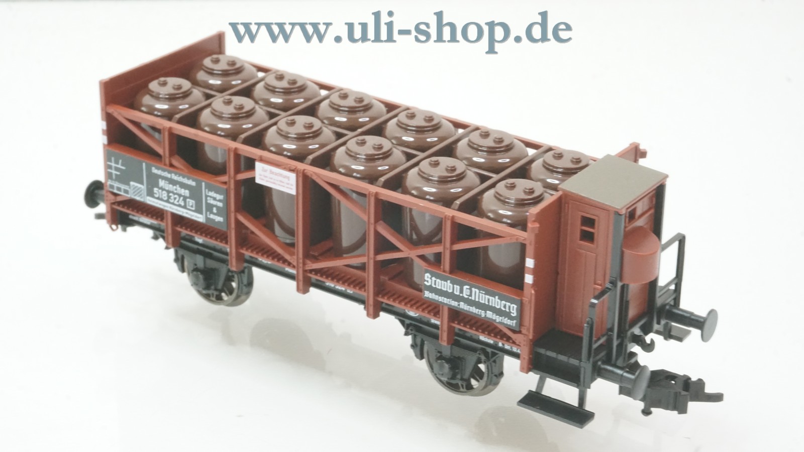 Fleischmann H0 Güterwagen mit der Artikelnummer 5221 K Säuretopfwagen mit Bremserhaus der DRG München. Der Artikel ist für den Betrieb mit Gleichstrom vorgesehen. Die Originalverpackung ist vorhanden.