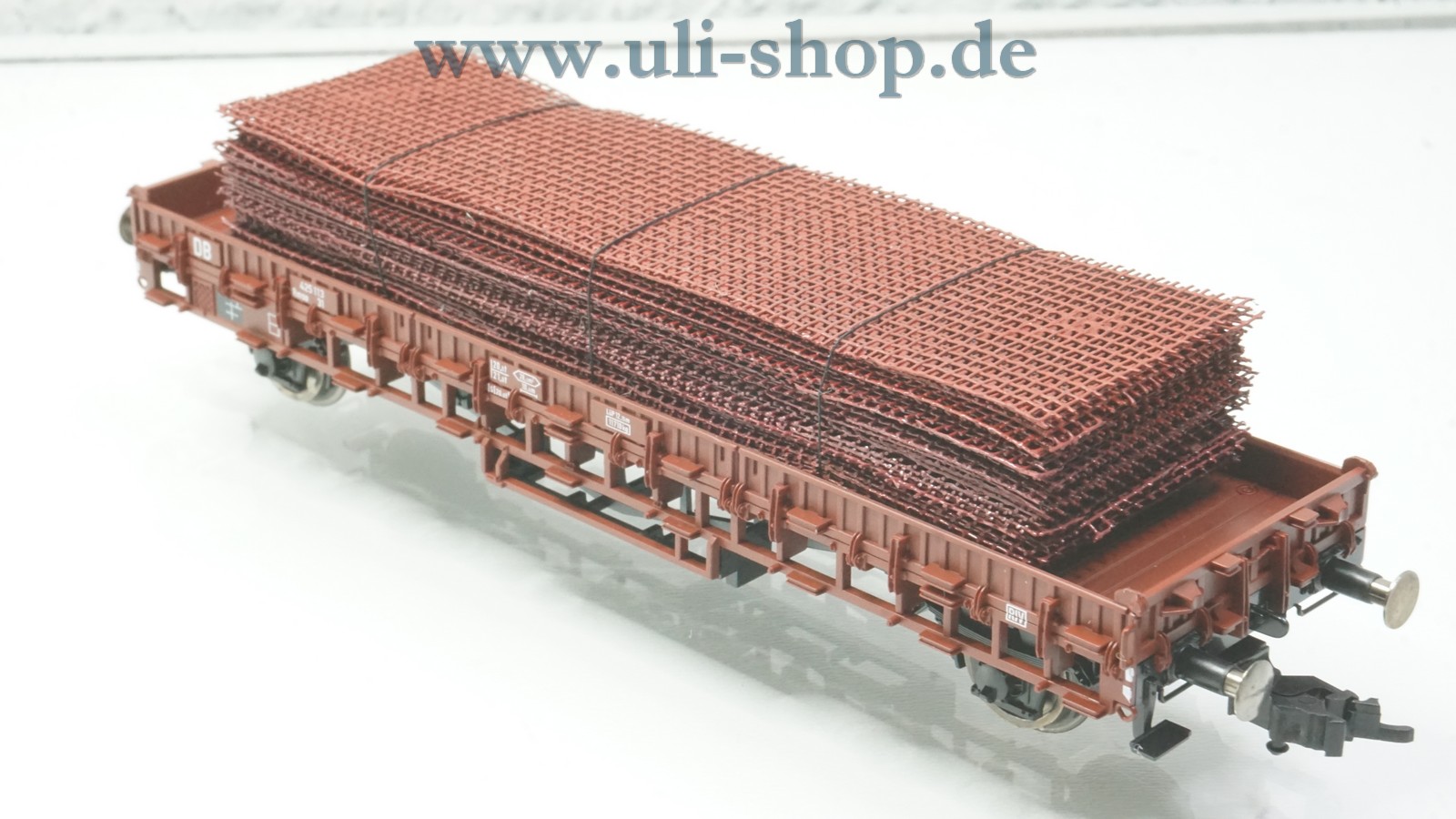 Fleischmann H0 Güterwagen mit der Artikelnummer 5258 K Niederbordwagen der DB beladen mit Baustahlmatten. Der Artikel ist für den Betrieb mit Gleichstrom vorgesehen. Die Originalverpackung ist vorhanden.
