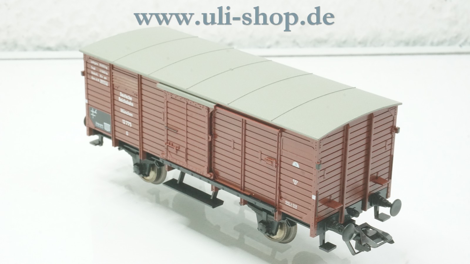 Fleischmann H0 Güterwagen mit der Artikelnummer 5361 K gedeckt Flachdach der DRG München. Der Artikel ist für den Betrieb mit Wechselstrom vorgesehen. Die Originalverpackung ist vorhanden.