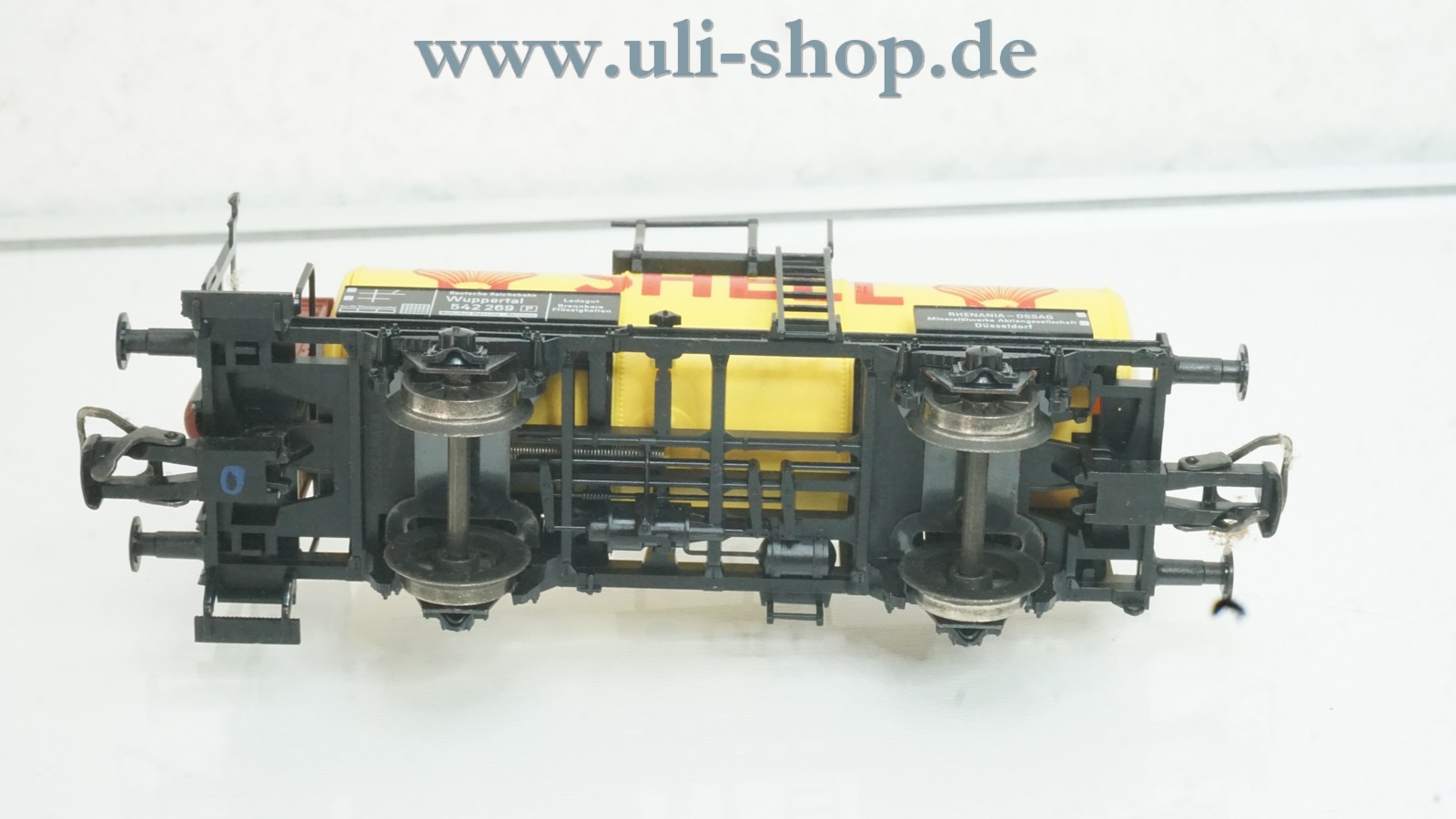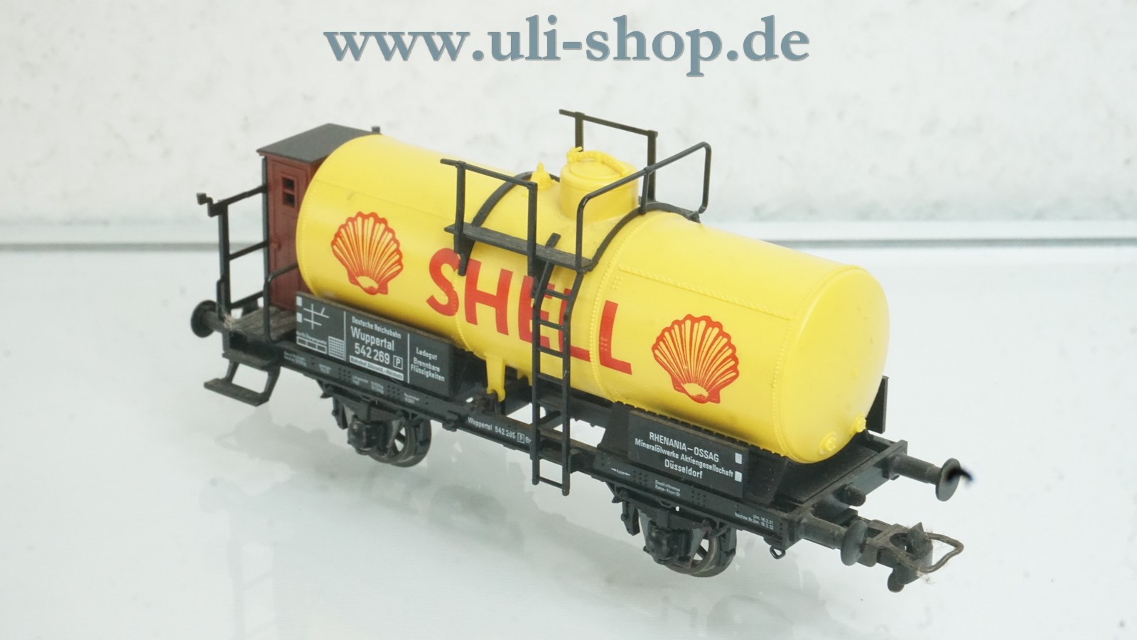 Fleischmann H0 Güterwagen mit der Artikelnummer 5432 K Kesselwagen mit Bremserhaus SHELL. Der Artikel ist für den Betrieb mit Wechselstrom vorgesehen. Die Originalverpackung ist vorhanden. Bei der Verschmutzung, die etwa rechts unten auf den Bildern zu sehen ist, handelt es um eine Verschmutzung der Linse und nicht des Modells.