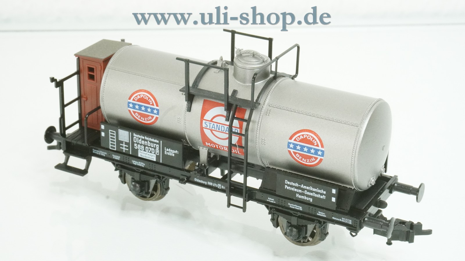 Fleischmann H0 Güterwagen mit der Artikelnummer 5433K Kesselwagen Standard Motor Oil der DR. Der Artikel ist für den Betrieb mit Gleichstrom vorgesehen. Die Originalverpackung ist vorhanden.
