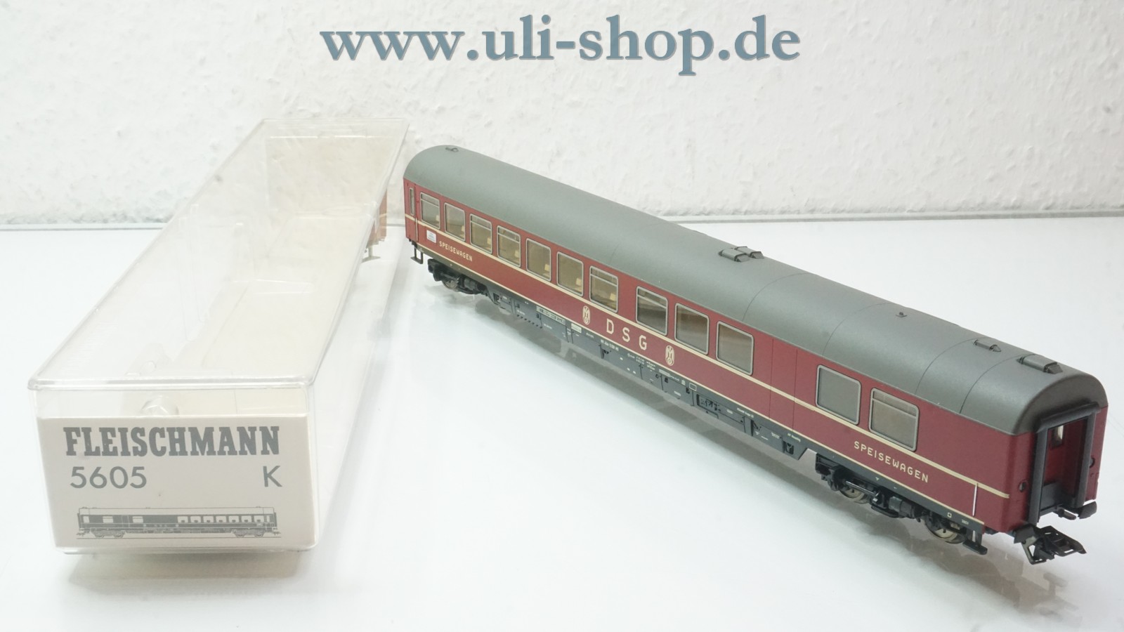 Fleischmann H0 Personenwagen mit der Artikelnummer 5605 K Speisewagen der DSG. Der Artikel ist für den Betrieb mit Wechselstrom vorgesehen. Die Originalverpackung ist vorhanden.