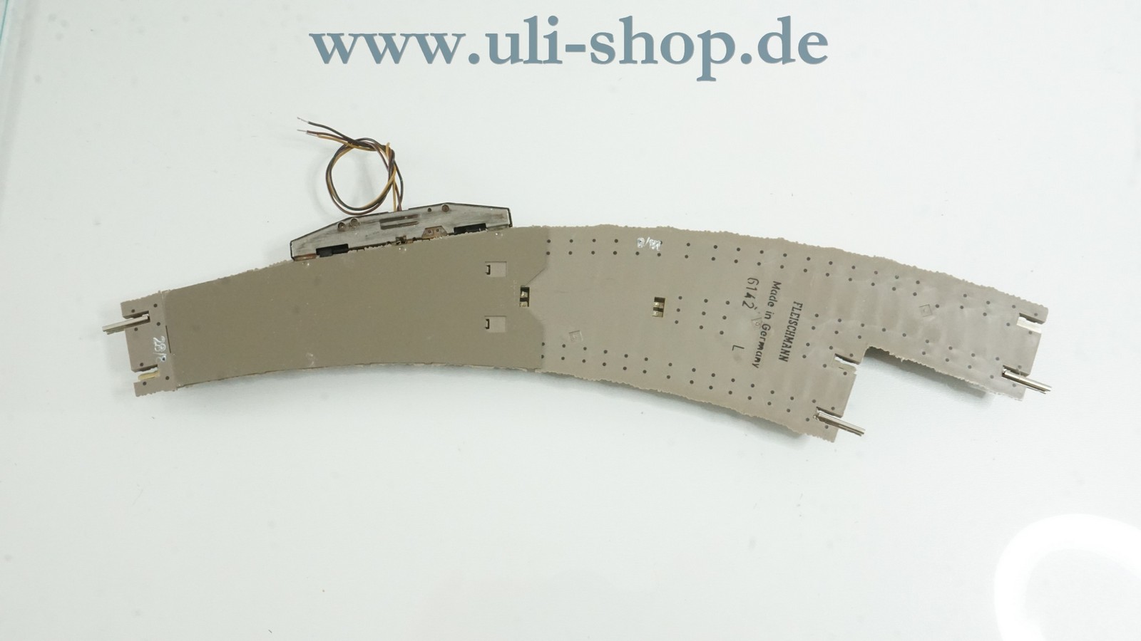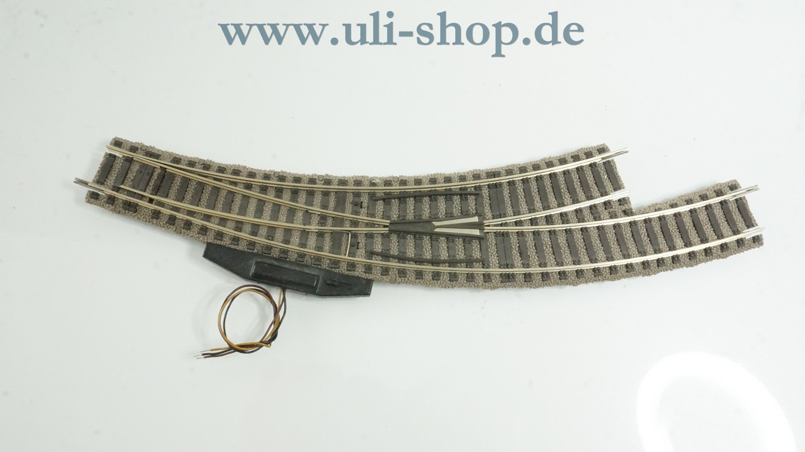 Fleischmann H0 Gleismaterial mit der Artikelnummer 6142 L Profigleis Bogenweiche links mit Antrieb. Der Artikel ist für den Betrieb mit Gleichstrom vorgesehen. Die Originalverpackung ist leider nicht mehr vorhanden.