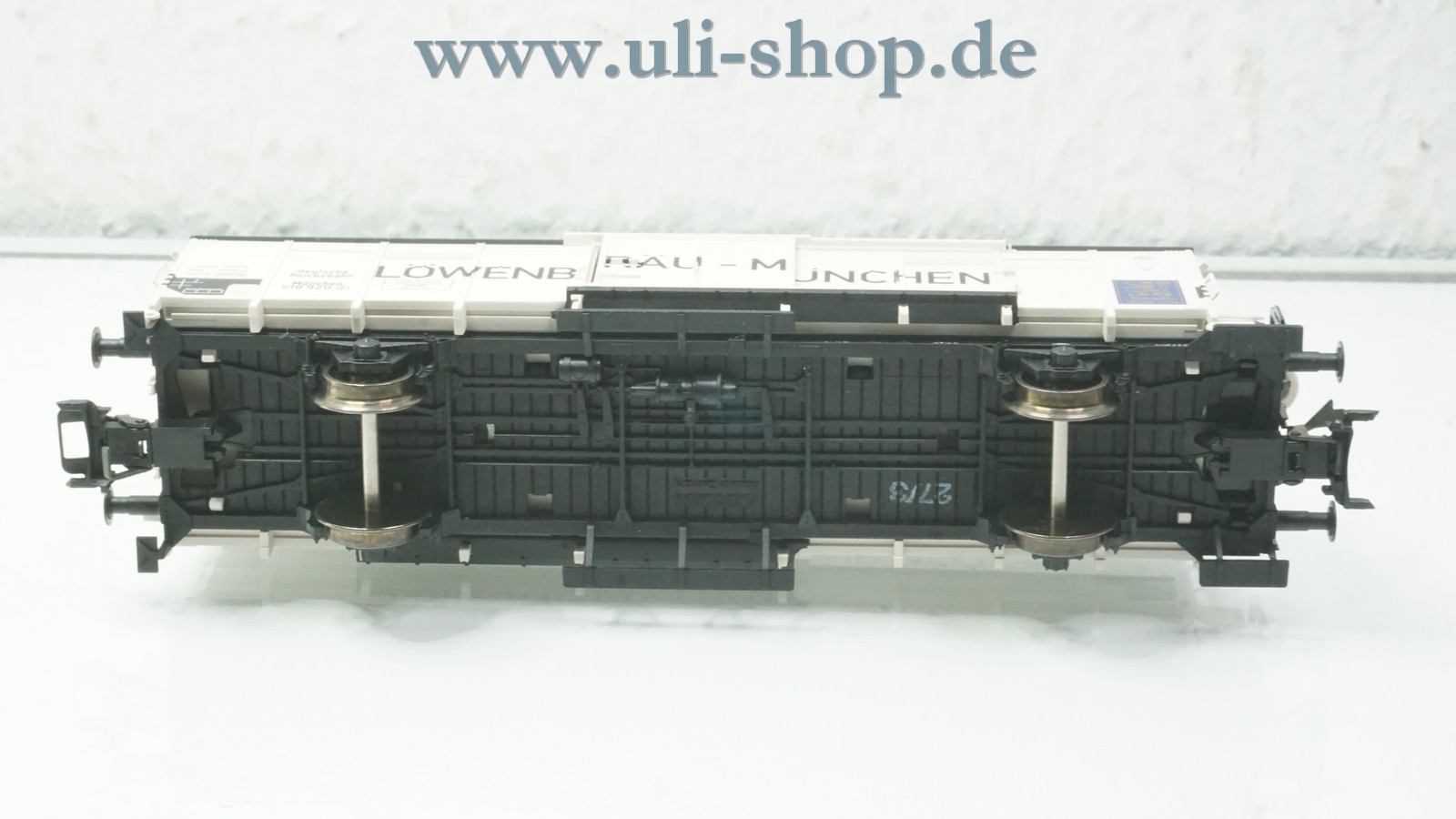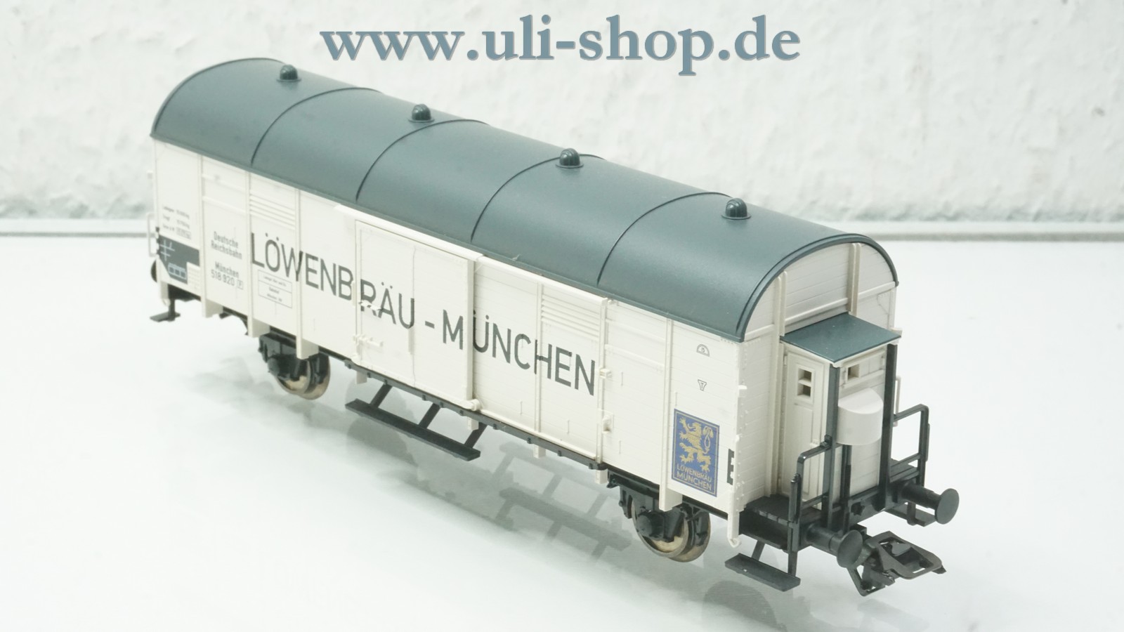 Fleischmann H0 Güterwagen mit der Artikelnummer 83 5307 K Kühlwagen Löwenbräu mit Bremserhaus der DRG München. Der Artikel ist für den Betrieb mit Wechselstrom vorgesehen. Die Originalverpackung ist vorhanden.
