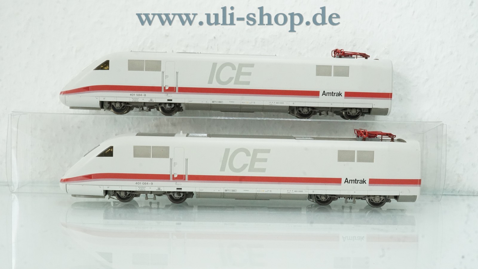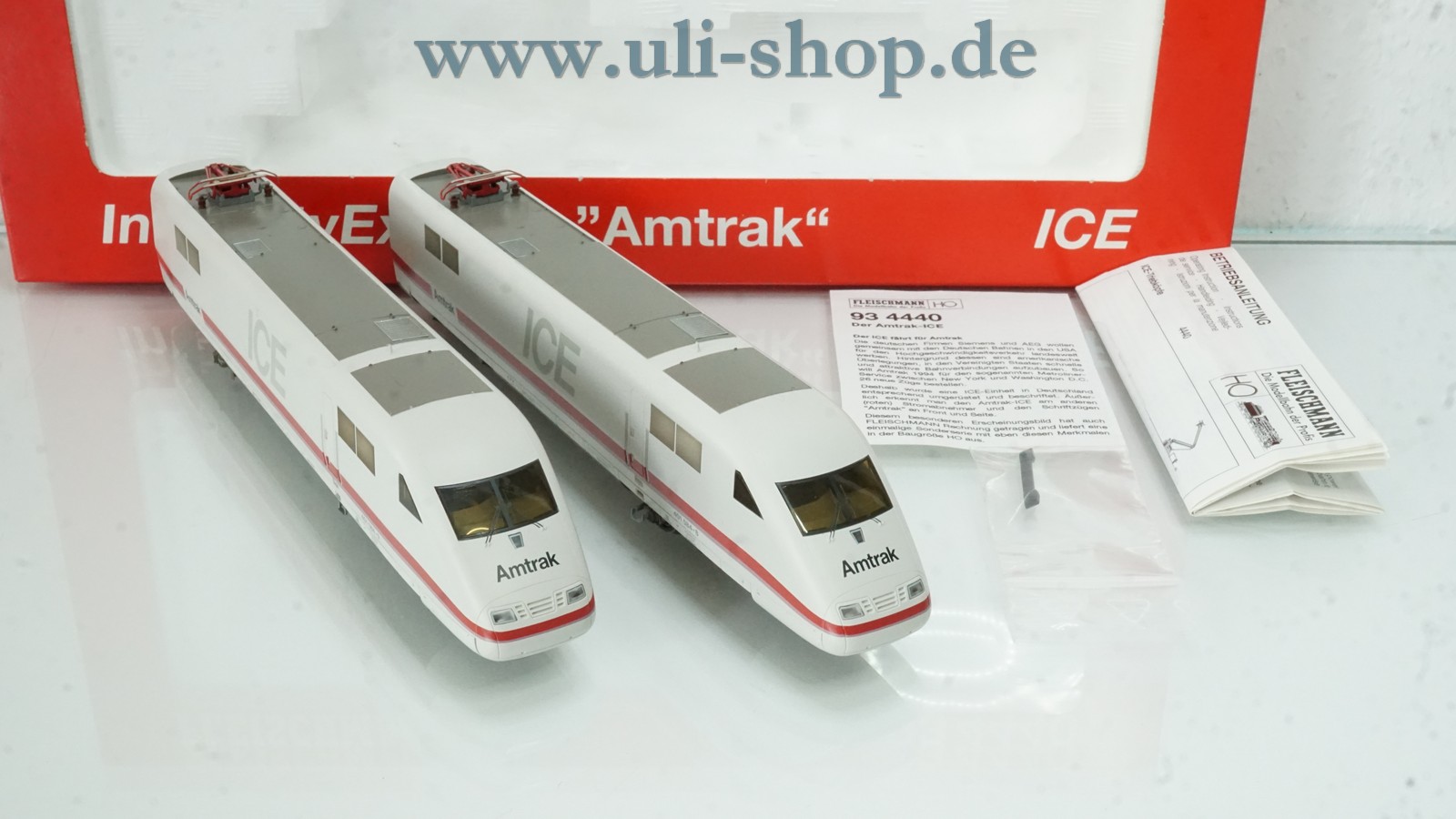 Fleischmann H0 Triebwagen mit der Artikelnummer 93 4440 ICE 1 Amtrak 2-teilig. Der Artikel ist für den Betrieb mit Gleichstrom vorgesehen. Die Lok ist analog, sie kann daher nicht auf digital gesteuerten Anlagen fahren. Die Originalverpackung ist vorhanden. Eine Kupplung ist vorhanden und liegt der Verpackung bei.