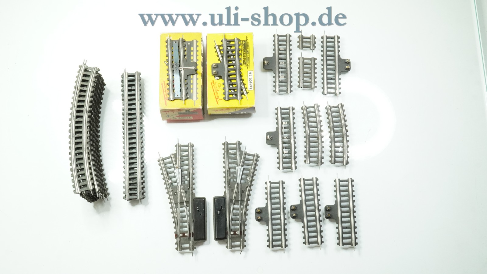 Fleischmann H0 Konvolut Hohlprofilschienen mit Pappbettung. In dem Konvolut sind 12 Gebogene, 3 Gerade, 5 Gerade Anschlussgleise, 2 Sondergleis, 3 Entkupplungsgleise, 4 kurze Gleise, 1 Weiche links und 1 Weiche rechts enthalten.
