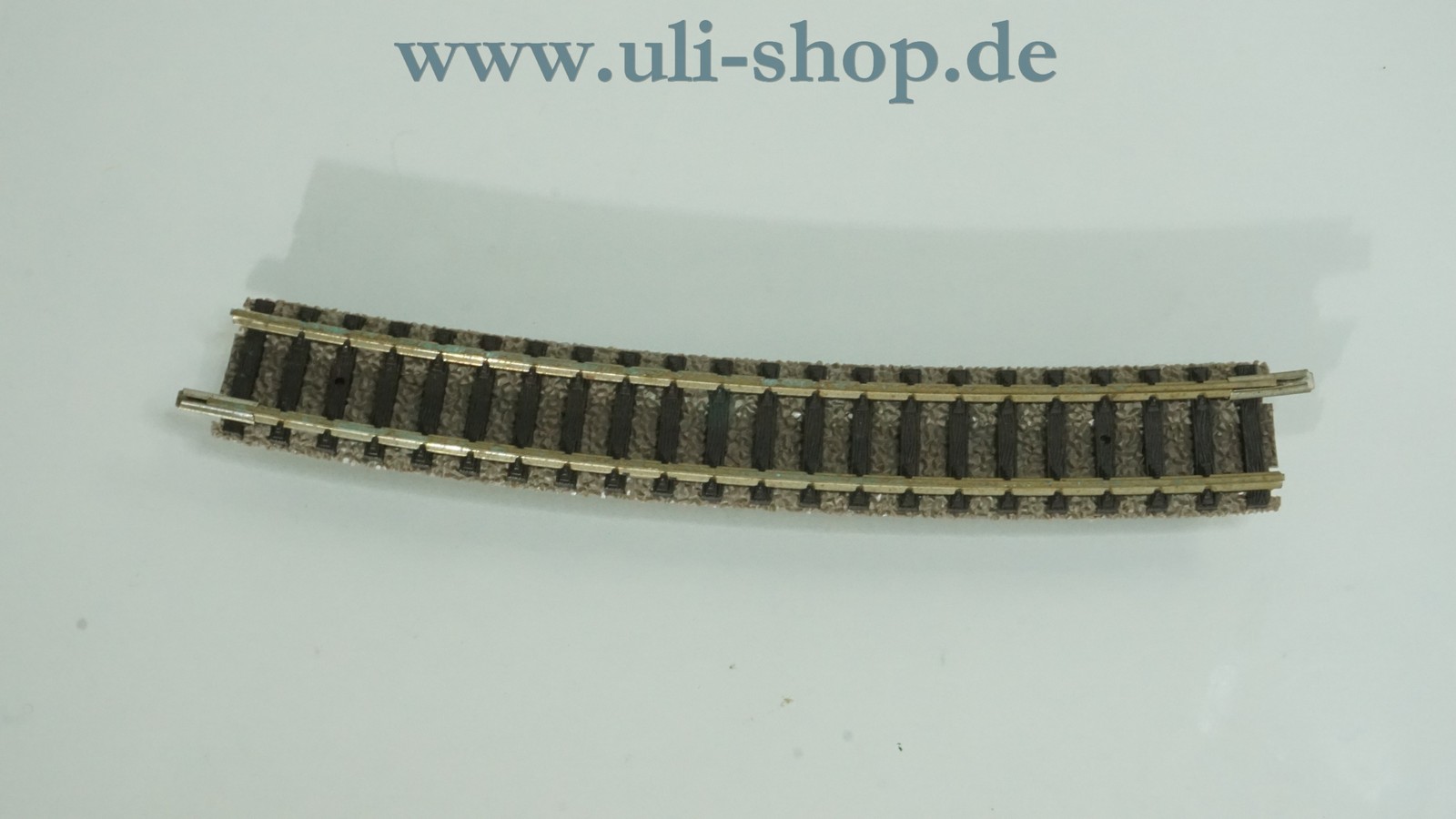 Fleischmann N Profigleis gebogen mit der Artikelnummer 9136 im bespieltem/gebrauchtem Zustand mit normalen Gebrauchsspuren (durch Spielbetrieb) ohne Originalverpackung. Evtl. minimale Farb- und Klebreste, ggf. auch minimal Rost und fehlenden Schienenverbinder, aber keine Beschädigungen.