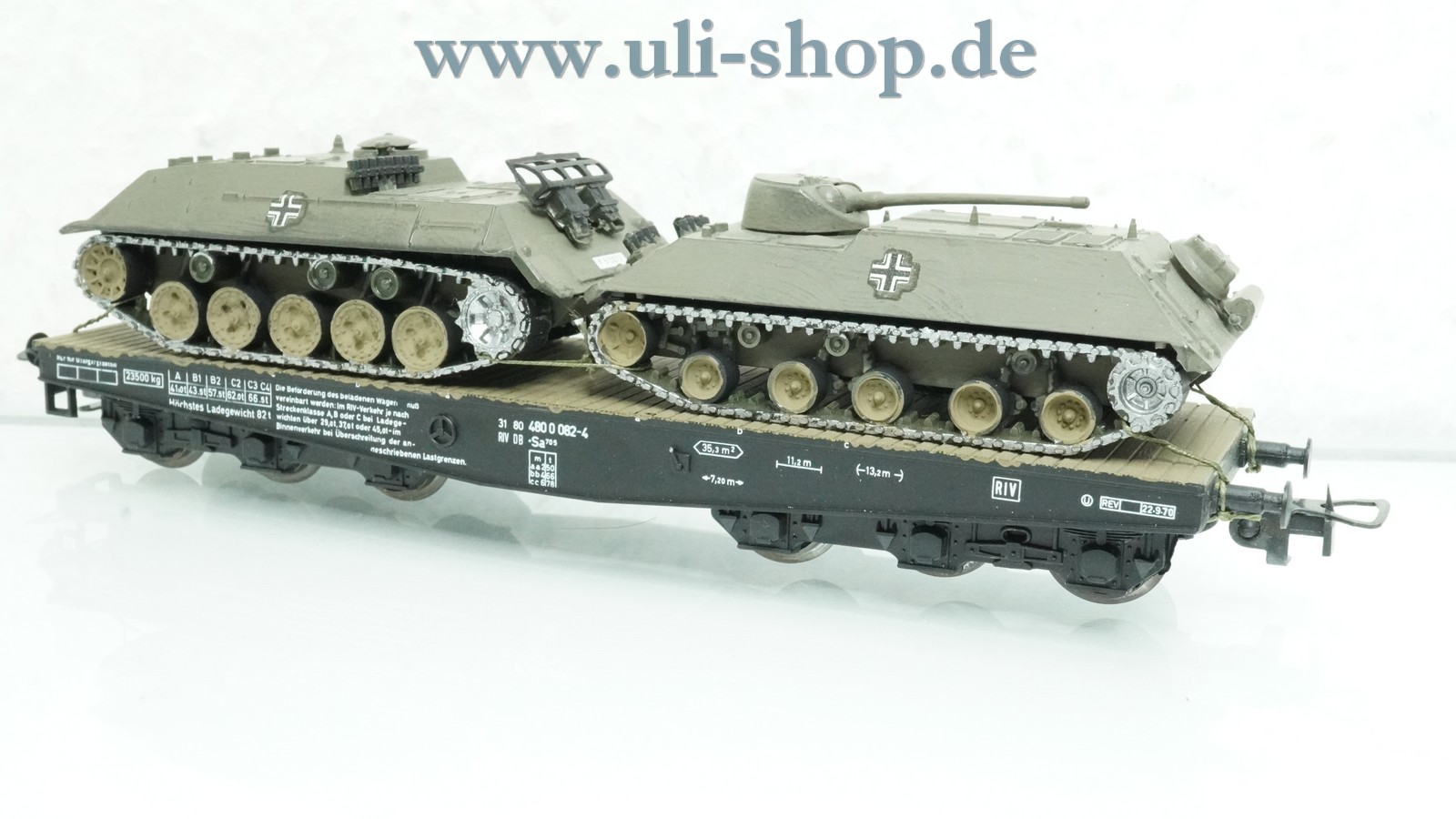 Liliput H0 Güterwagen mit der Artikelnummer 212 00 Schwerlastwagen der DB mit Panzern. Der Artikel ist für den Betrieb mit Wechselstrom vorgesehen. Die Originalverpackung ist leider nicht mehr vorhanden.
