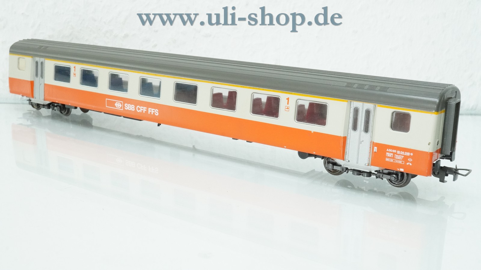 Liliput H0 Personenwagen mit der Artikelnummer 883 Swiss Express 1. Klasse der SBB. Der Artikel ist für den Betrieb mit Gleichstrom vorgesehen. Die Originalverpackung ist leider nicht mehr vorhanden. Es handelt sich hier nur um einen Einzelwagen aus der Wagenpackung mit der Artikelnummer 883.