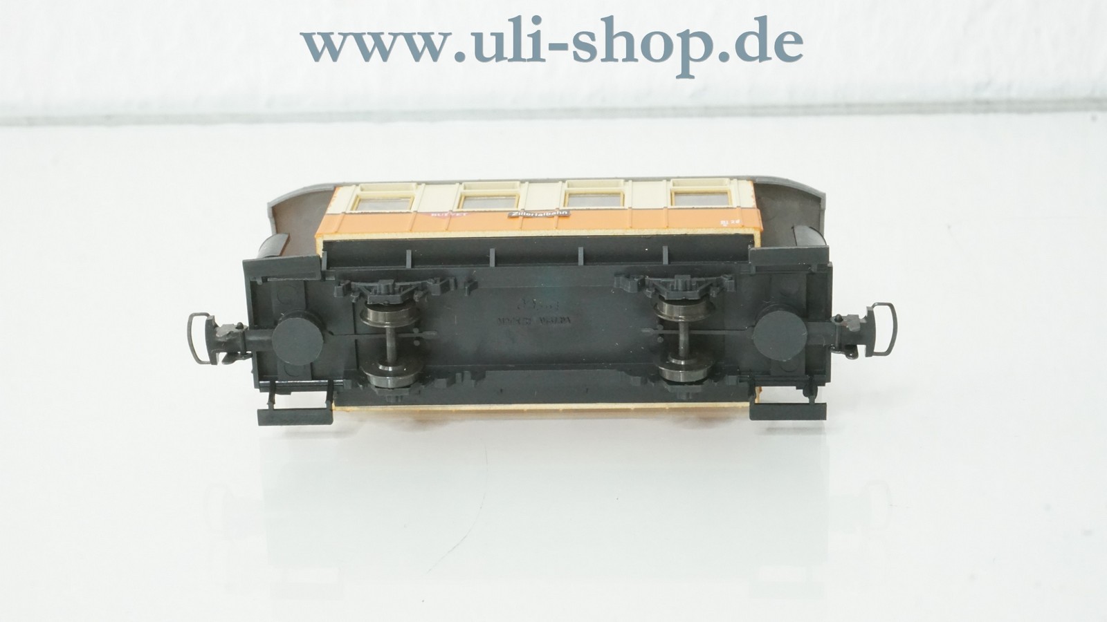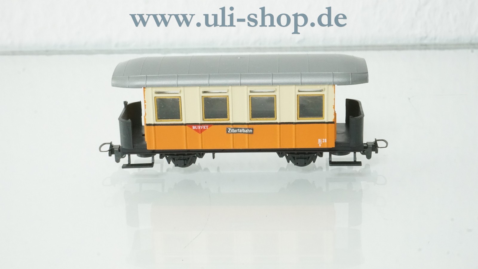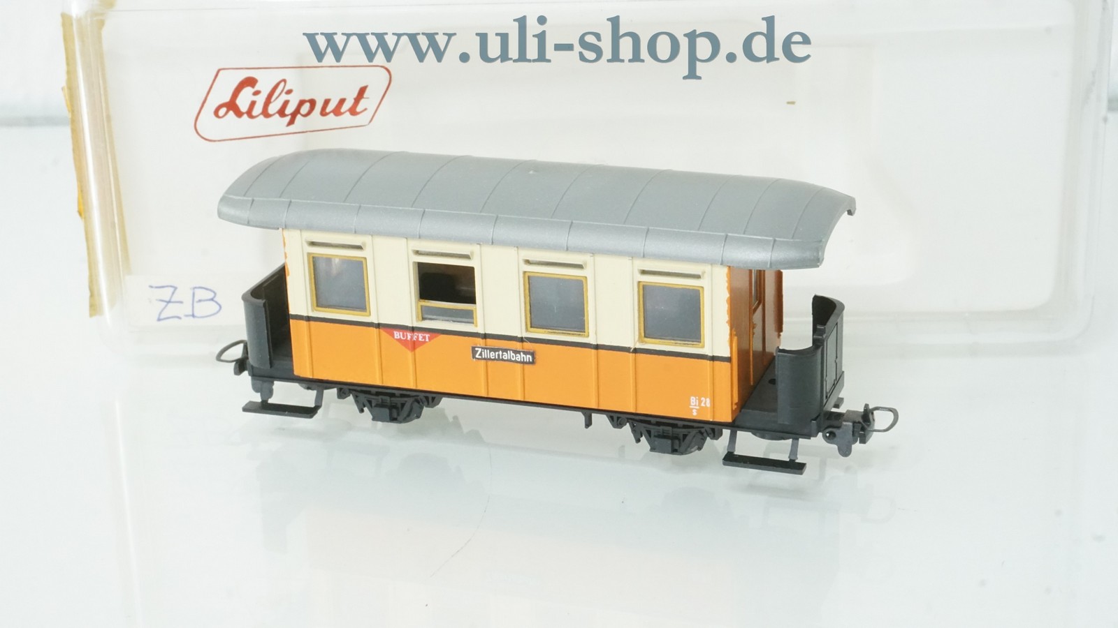 Liliput H0e Personenwagen mit der Artikelnummer 719 Buffetwagen Zillertalbahn. Der Artikel ist für den Betrieb mit Gleichstrom vorgesehen. Die Originalverpackung ist vorhanden. Die Spurweite entspricht 9mm (Spur N). Der Wagen wurde schon mit den Farbverschmierung im cremefarbigen Fensterbereich an den Kanten ausgeliefert. Wahrscheinlich war dies ein Drucktechnischer Fehler oder ein Lackierungsfehler.