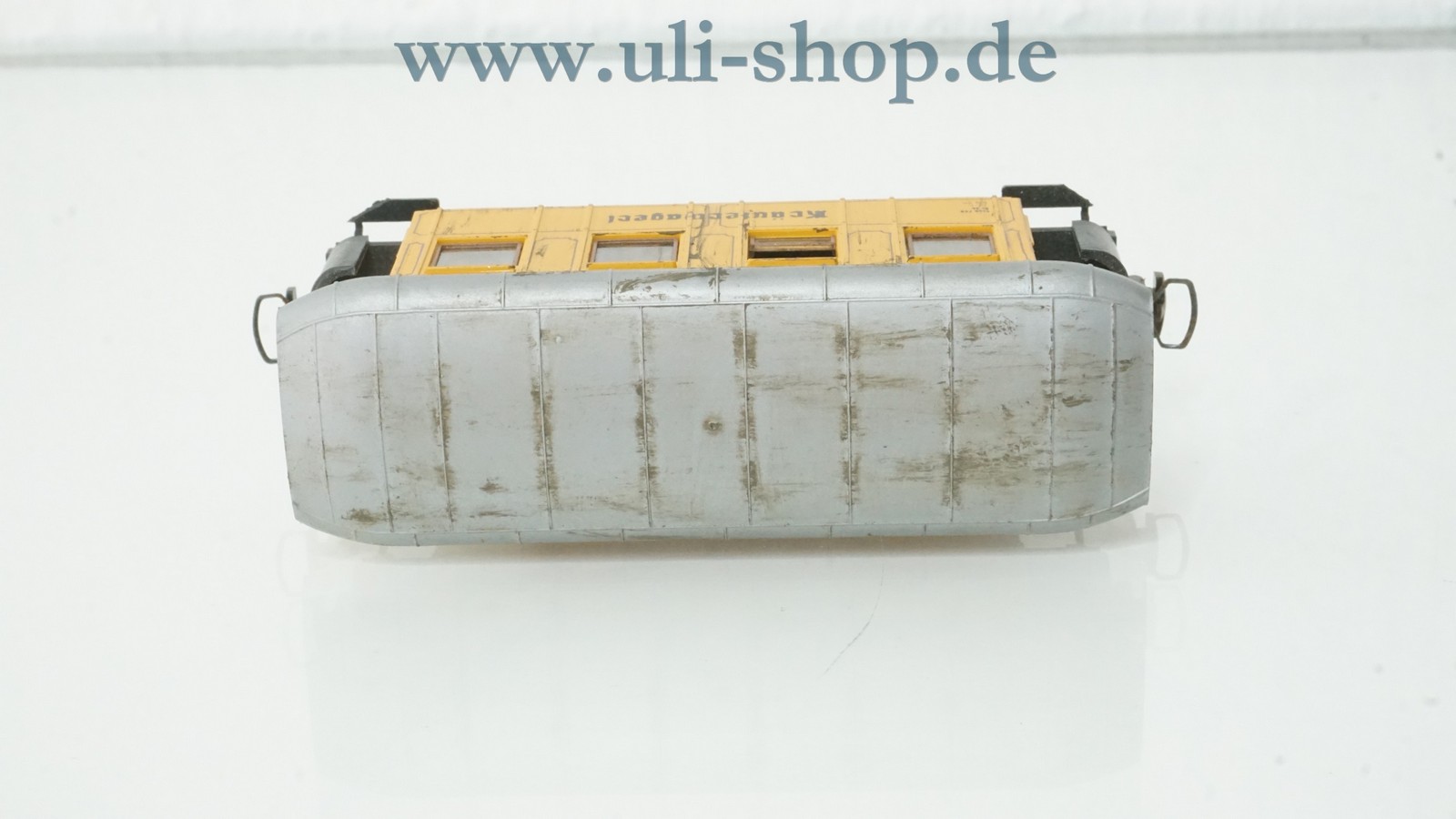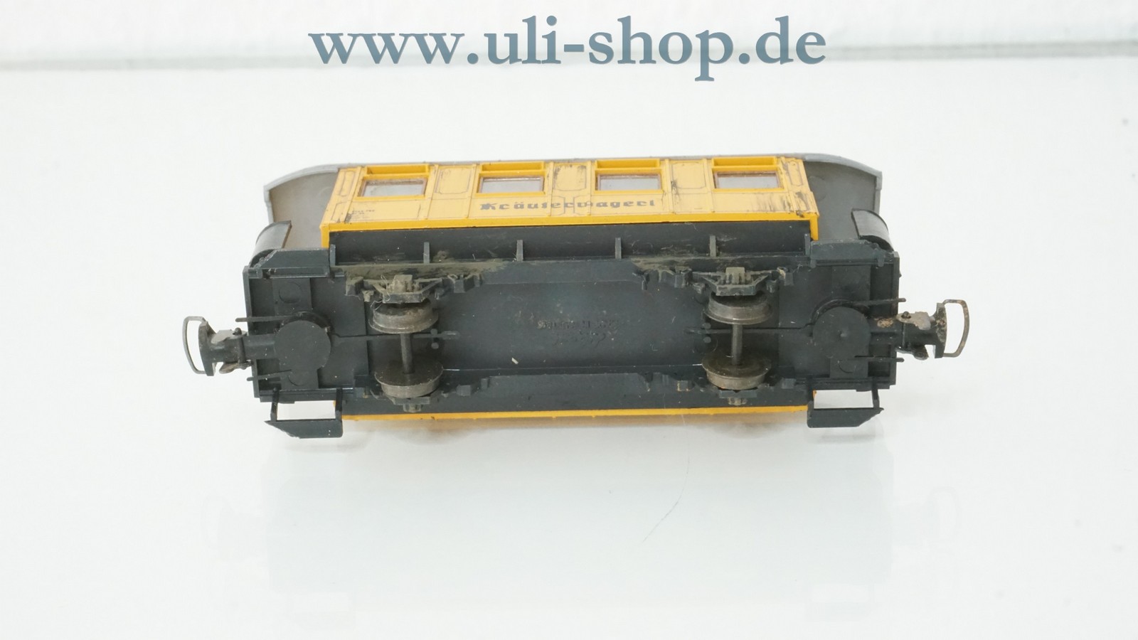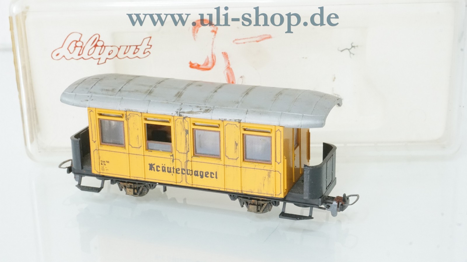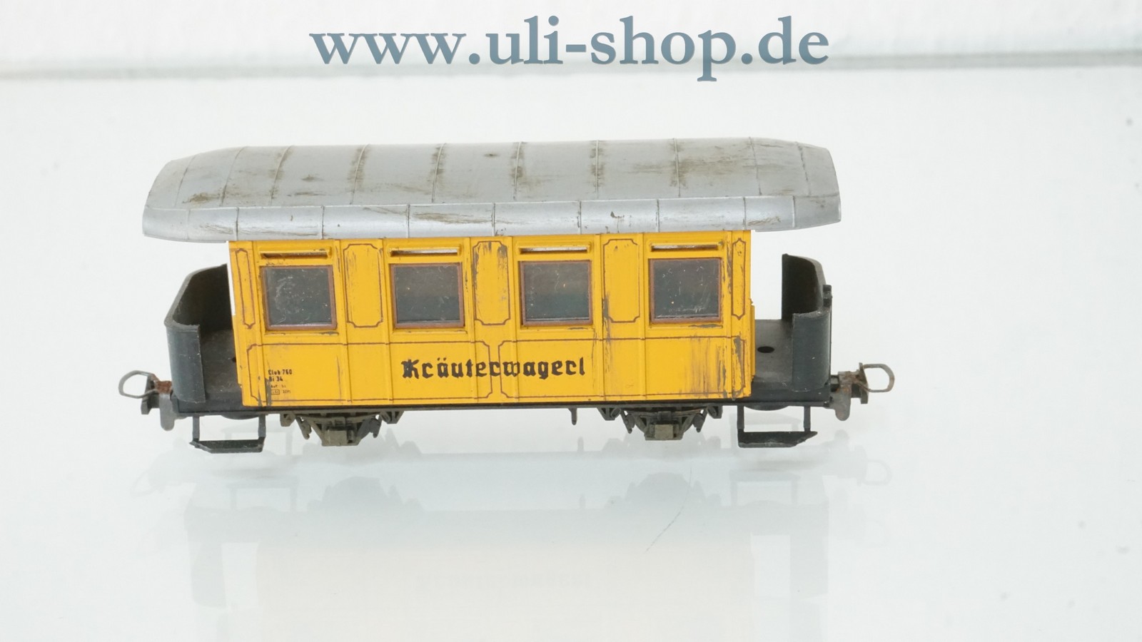 Liliput H0e Personenwagen mit der Artikelnummer 774 Kräuterwagerl Club 760 gealtert. Der Artikel ist für den Betrieb mit Gleichstrom vorgesehen. Die Originalverpackung ist vorhanden. Die Spurweite entspricht 9mm (Spur N). Der Wagen wurde nachträglich gealtert. Der Wagen stammt von Stainzer Flascherlzug.