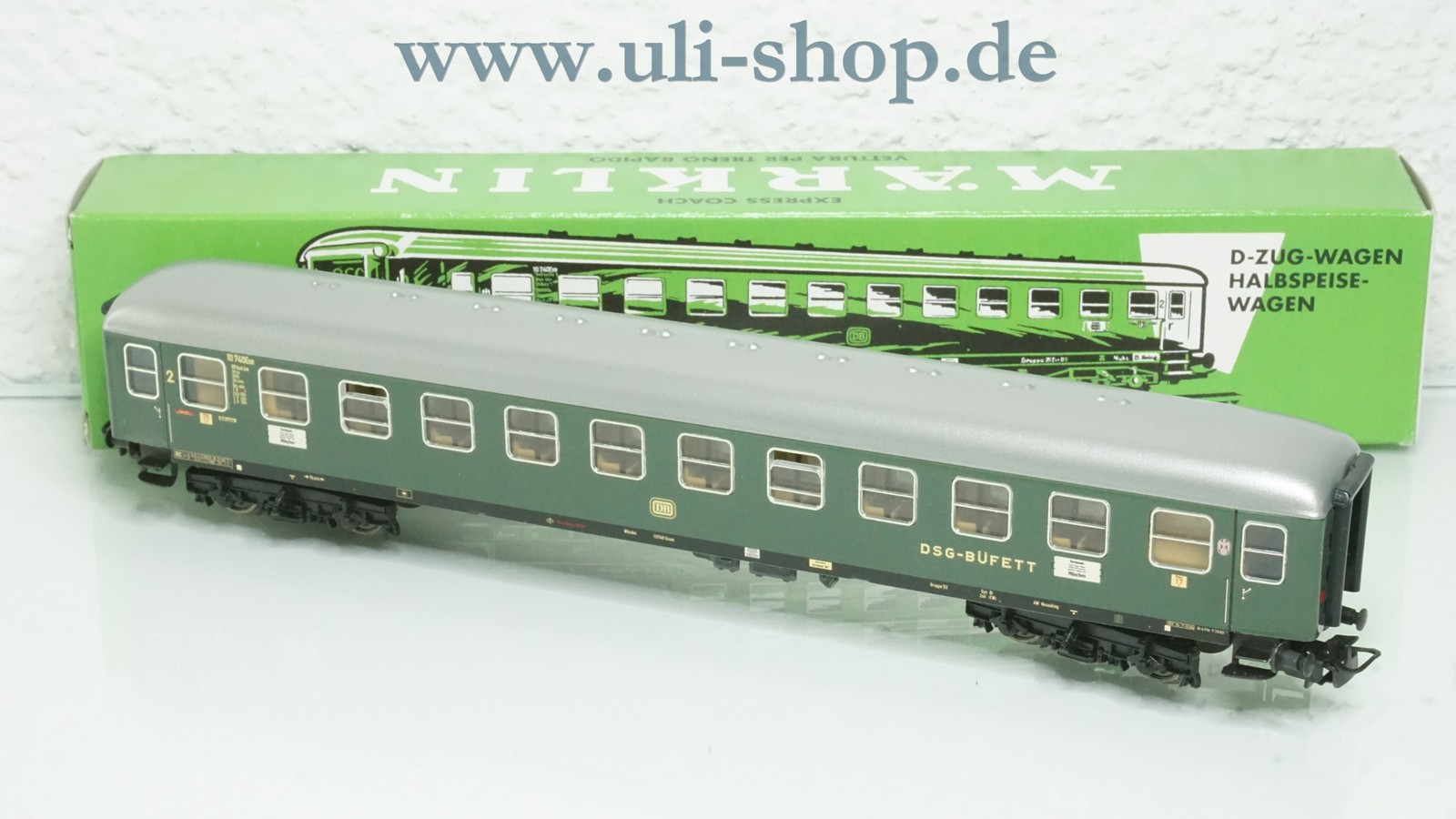 Märklin H0 Personenwagen mit der Artikelnummer 00766-01 D-Zug Halbspeisewagen der DB. Der Artikel ist für den Betrieb mit Wechselstrom vorgesehen. Die Originalverpackung ist vorhanden.