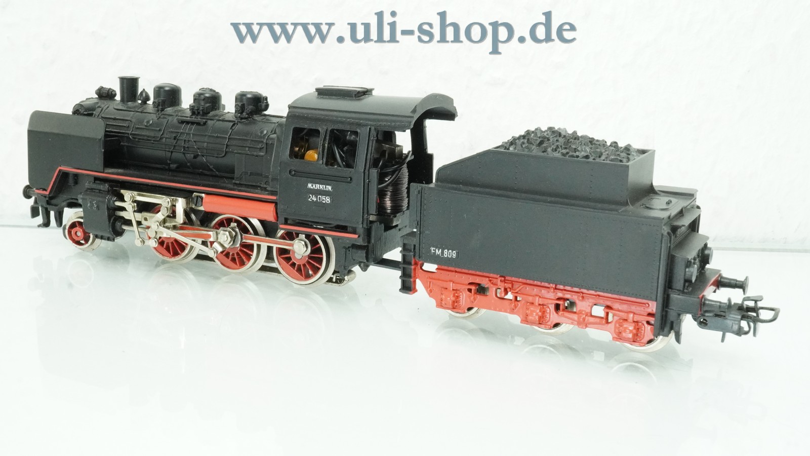 Märklin H0 Dampflok mit der Artikelnummer 3003 Br. 24 058 der DB. Der Artikel ist für den Betrieb mit Wechselstrom vorgesehen. Die Lok ist analog, sie kann daher nicht auf digital gesteuerten Anlagen fahren. Die Originalverpackung ist leider nicht mehr vorhanden.