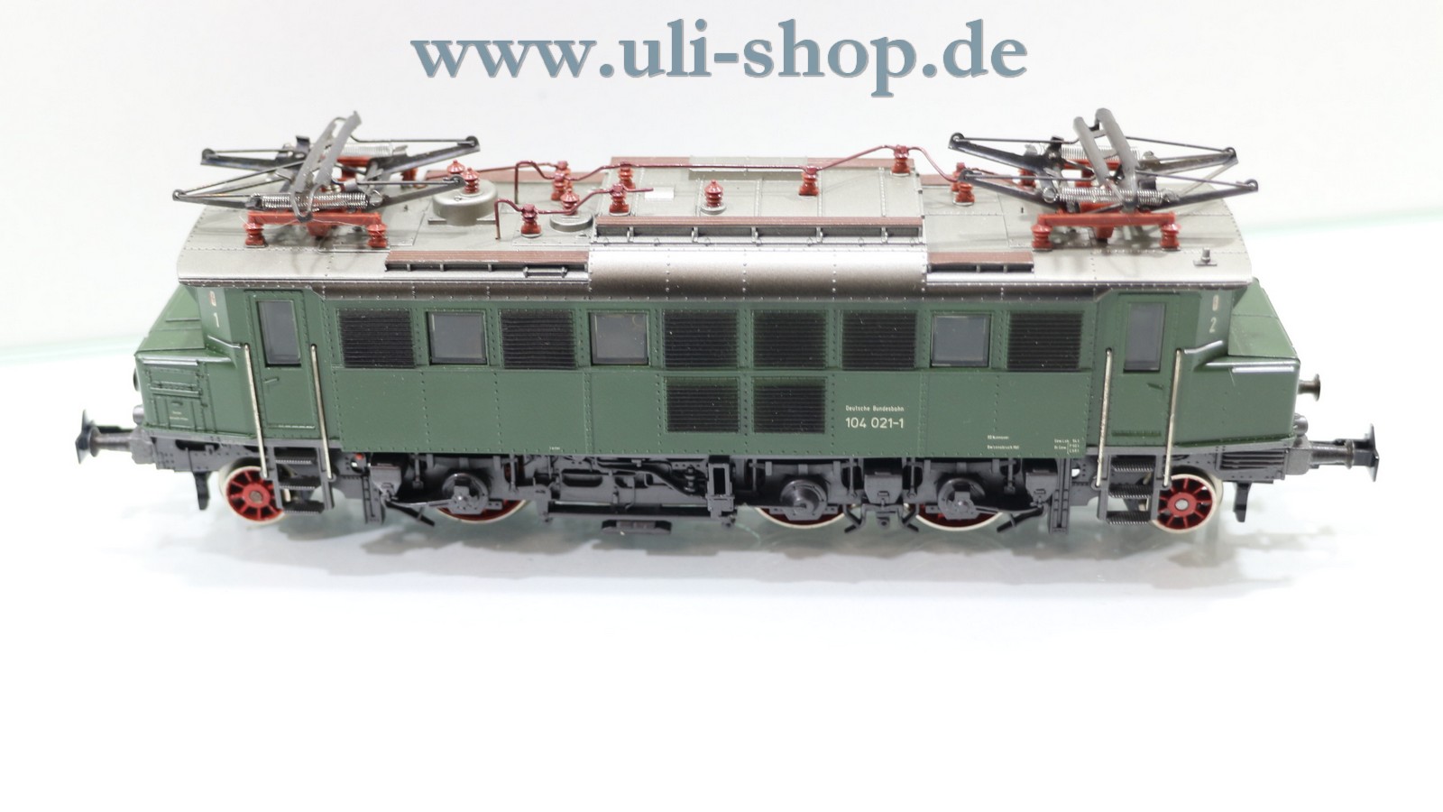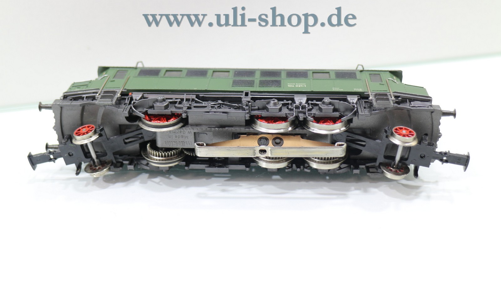 Märklin H0 E-Lok mit der Artikelnummer 3049 Br. 104 021 -1 der DB. Der Artikel ist für den Betrieb mit Wechselstrom vorgesehen. Die Lok ist analog, sie kann daher nicht auf digital gesteuerten Anlagen fahren. Die Originalverpackung ist vorhanden.