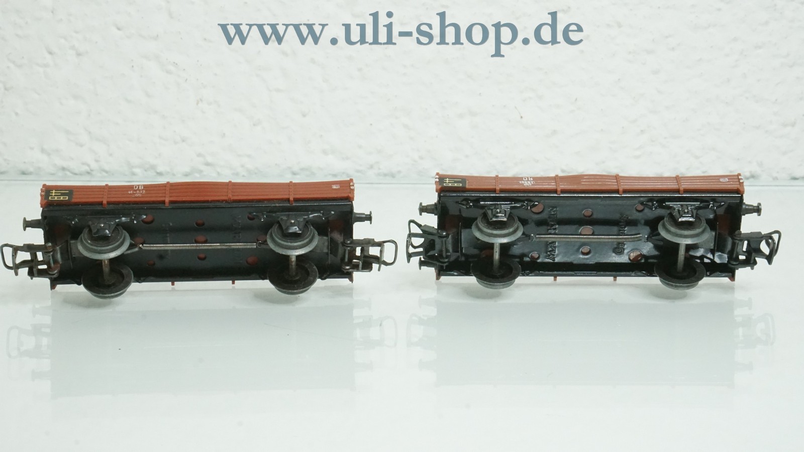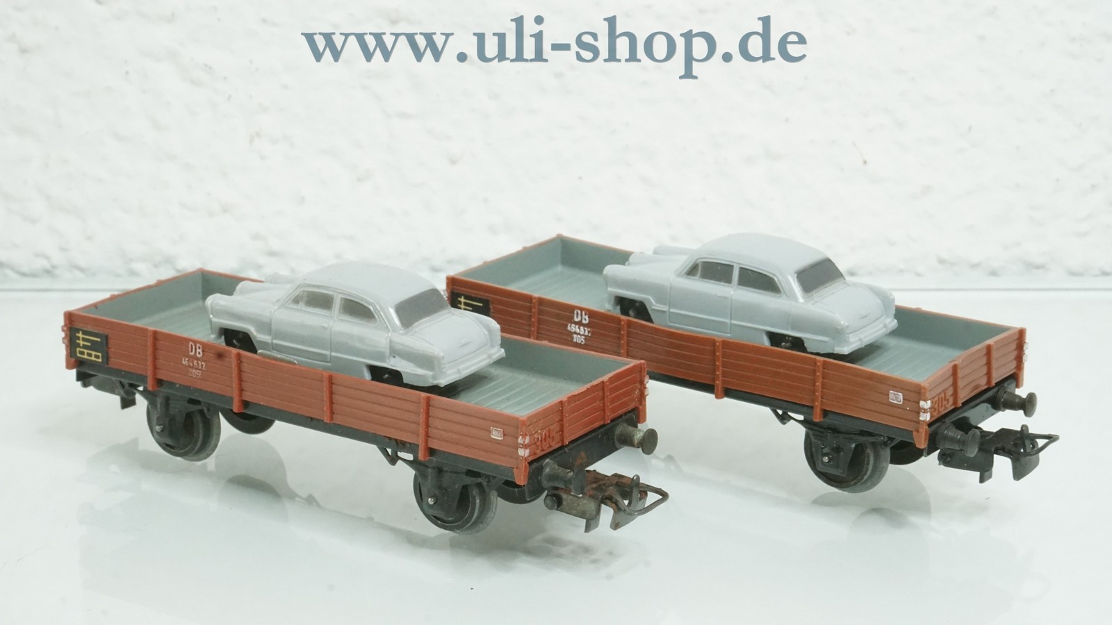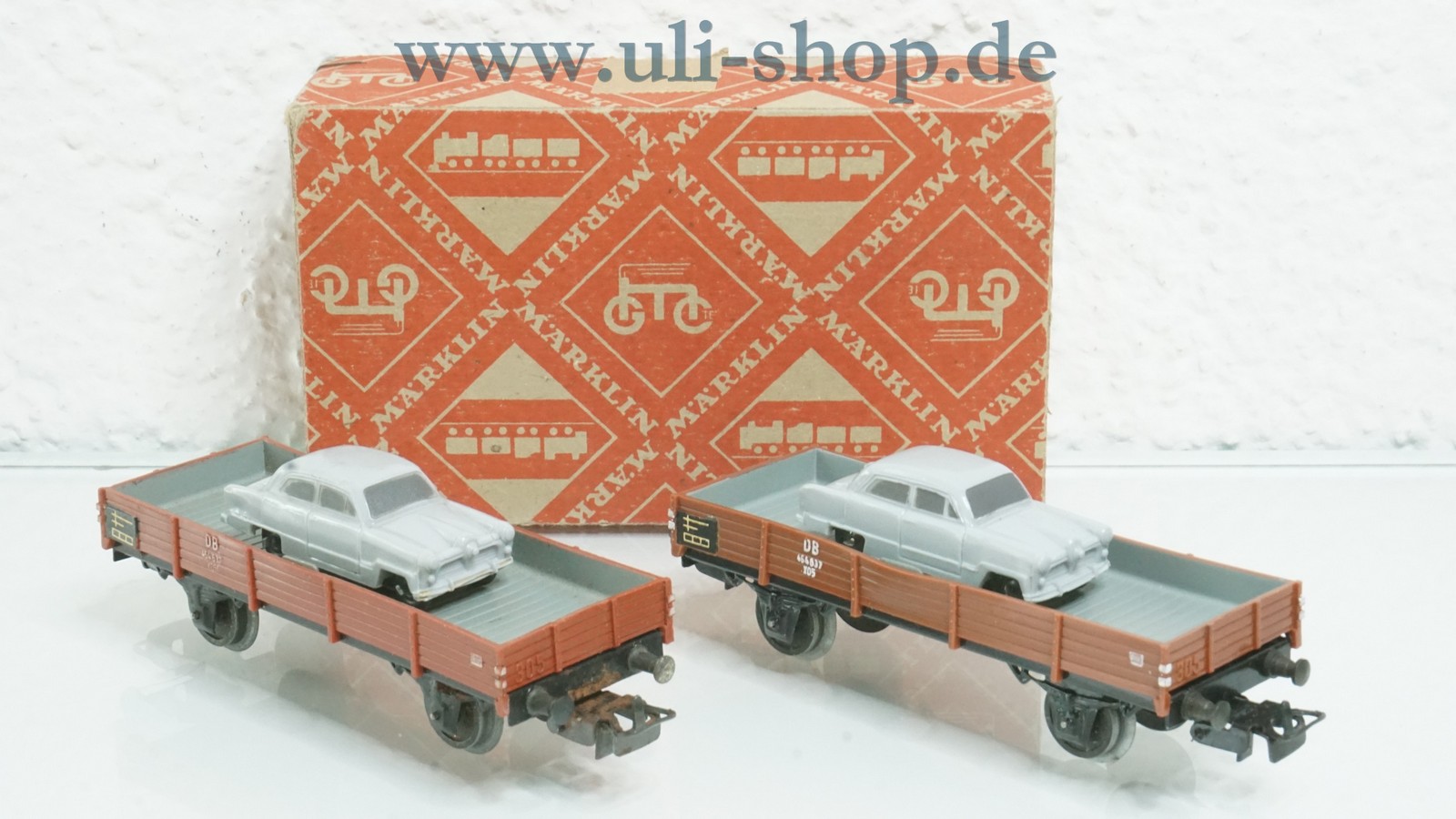 Märklin H0 Güterwagen mit der Artikelnummer 305/2 2 Niederbordwagen mit Auto beladen. Der Artikel ist für den Betrieb mit Wechselstrom vorgesehen. Die Originalverpackung ist vorhanden. Die Wagenkasten sind leicht verformt. Die Kupplungen sind leicht verrostet.