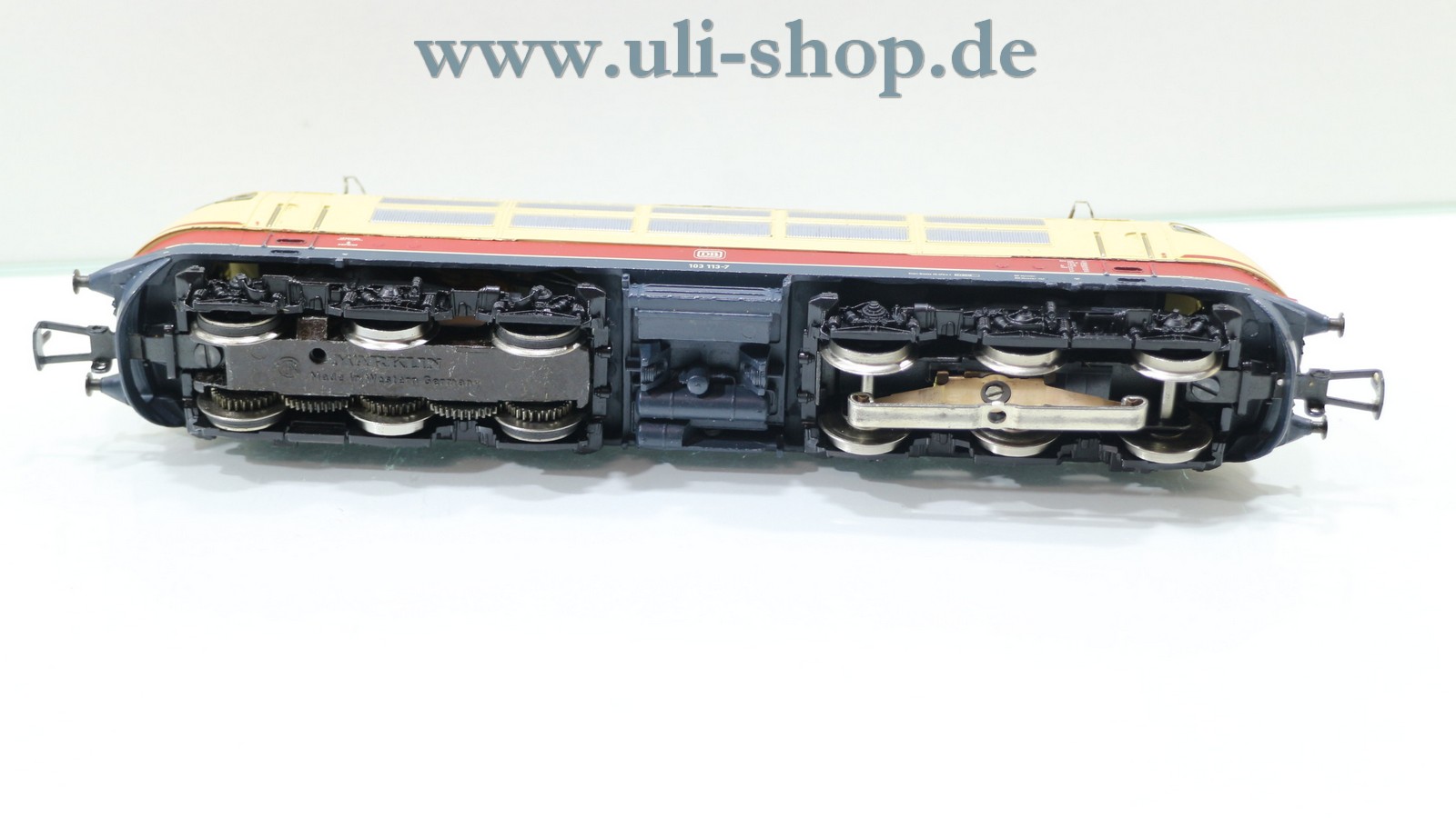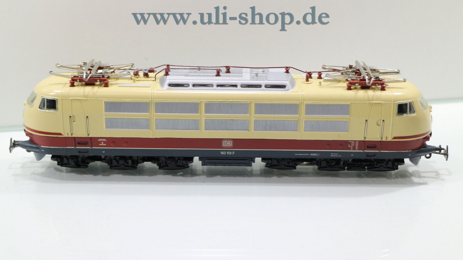 Märklin H0 E-Lok mit der Artikelnummer 3054 Br. 103 113-7 der DB mit schwarzem Rahmen. Der Artikel ist für den Betrieb mit Wechselstrom vorgesehen. Die Lok ist analog, sie kann daher nicht auf digital gesteuerten Anlagen fahren. Die Originalverpackung ist vorhanden.