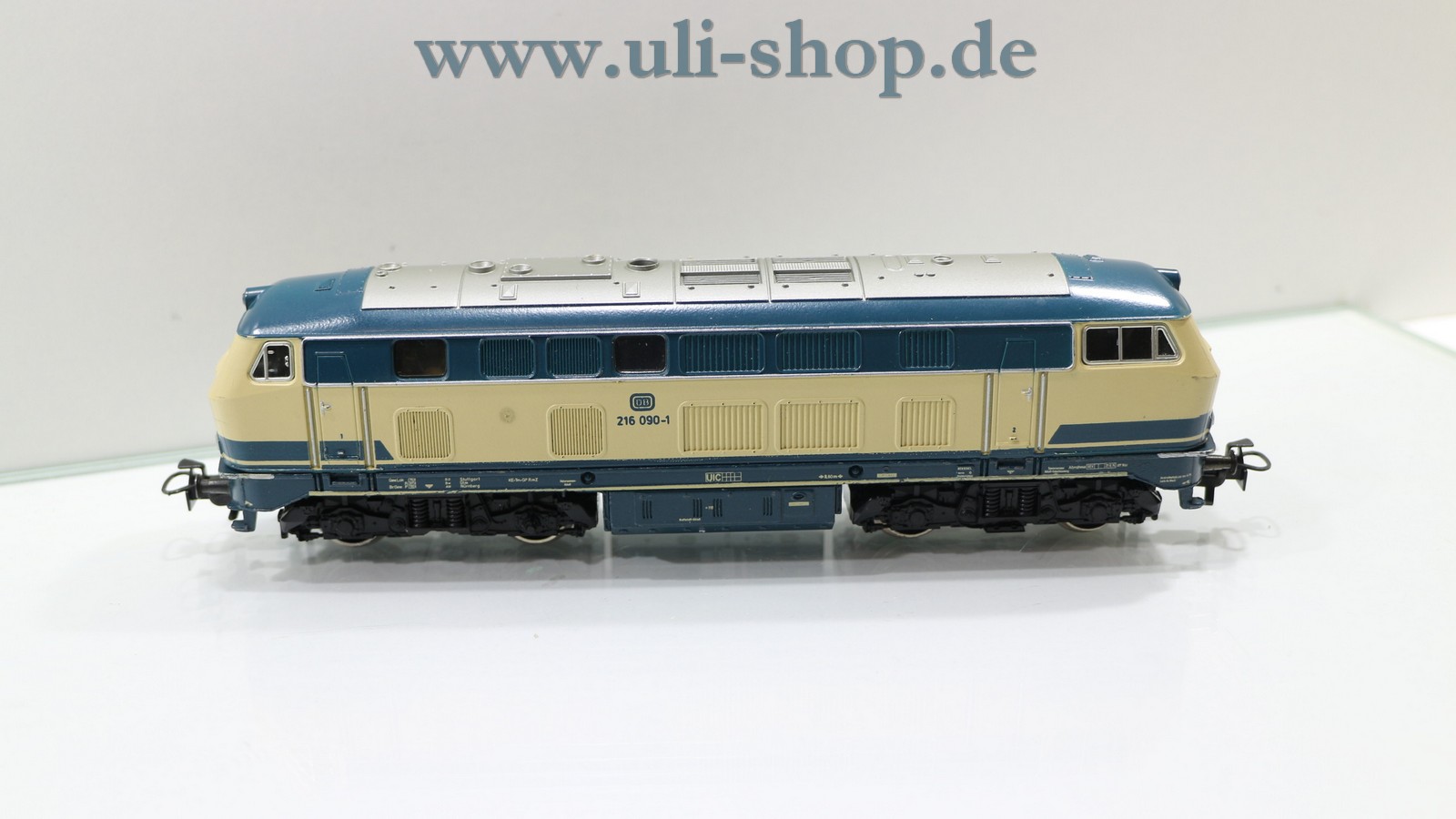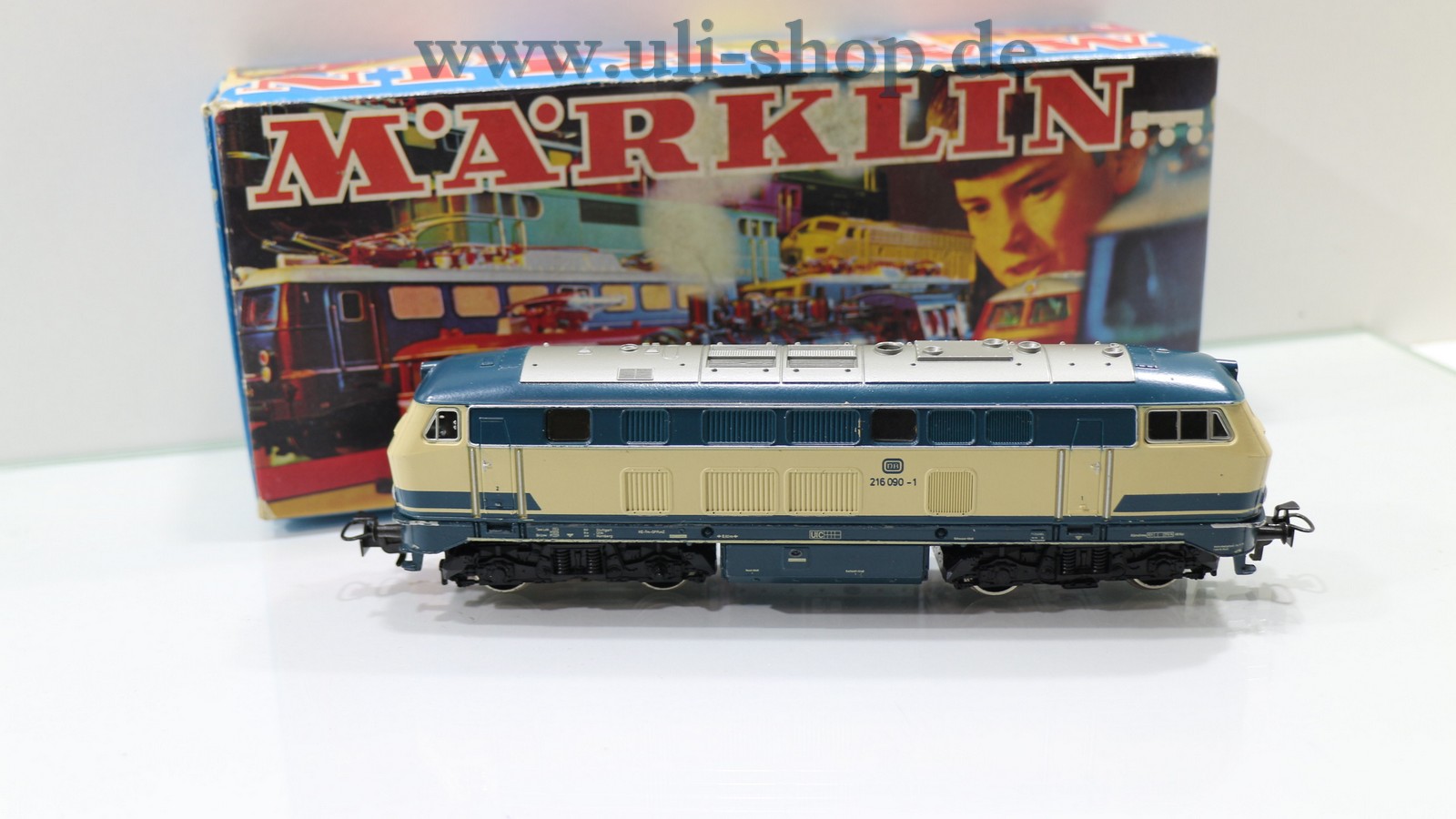 Märklin H0 Diesellok mit der Artikelnummer 3074 Br. 216 090-1 der DB. Der Artikel ist für den Betrieb mit Wechselstrom vorgesehen. Die Lok ist analog, sie kann daher nicht auf digital gesteuerten Anlagen fahren. Die Originalverpackung ist vorhanden.