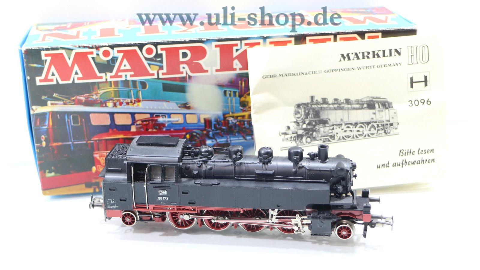 Märklin H0 Dampflok mit der Artikelnummer 3096 Br. 86 173 der DB. Der Artikel ist für den Betrieb mit Wechselstrom vorgesehen. Die Lok ist analog, sie kann daher nicht auf digital gesteuerten Anlagen fahren. Die Originalverpackung ist vorhanden.