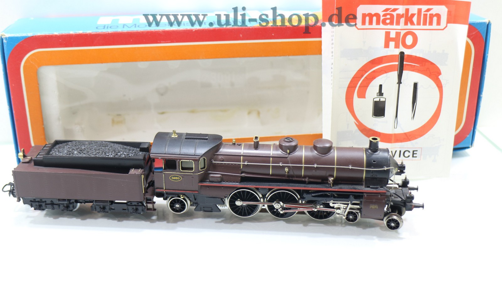 Märklin H0 Dampflok mit der Artikelnummer 3111 Br. 5920 braun der SNCB. Der Artikel ist für den Betrieb mit Wechselstrom vorgesehen. Die Lok ist analog, sie kann daher nicht auf digital gesteuerten Anlagen fahren. Die Originalverpackung ist vorhanden.
