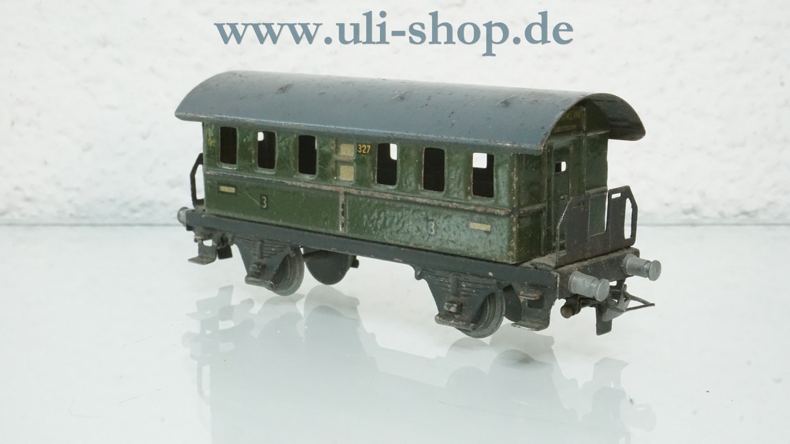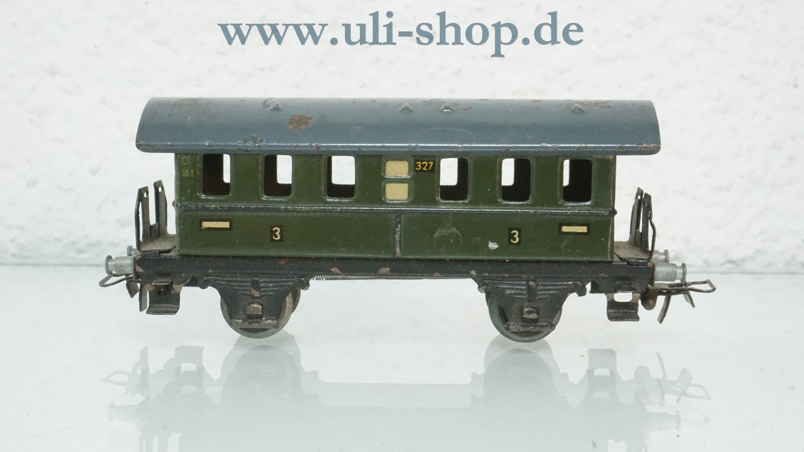 Märklin H0 mit der Artikelnummer 327 alter Personenwagen. Der Artikel ist für den Betrieb mit Wechselstrom vorgesehen. Die Achsen haben etwas Flugrost.