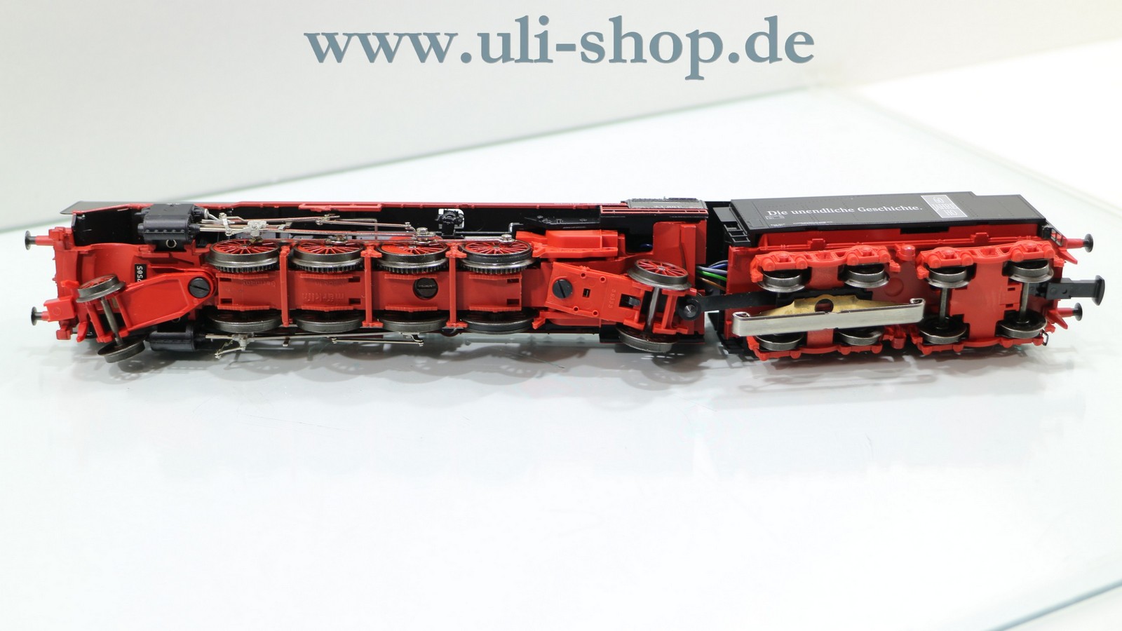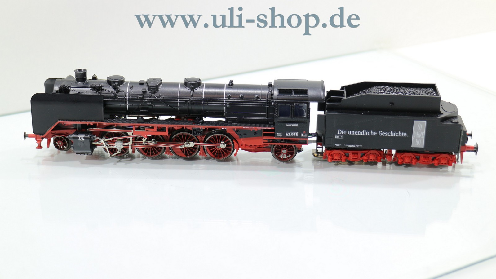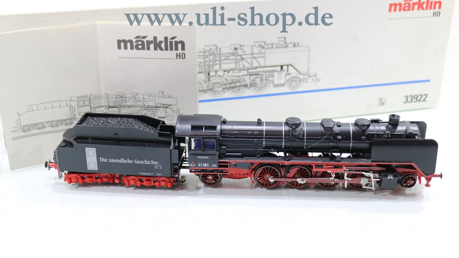 Märklin H0 Dampflok mit der Artikelnummer 33922 Br. 41 001. Der Artikel ist für den Betrieb mit Wechselstrom vorgesehen. Die Lok ist mit einem Delta-Modul ausgestattet und kann auch auf analogen und digital gesteuerten Anlagen fahren. Die Originalverpackung ist vorhanden. Es handelt sich um eine Sonderserie 60 Jahre H0 mit der Tenderaufschrift Eine unendliche Geschichte.