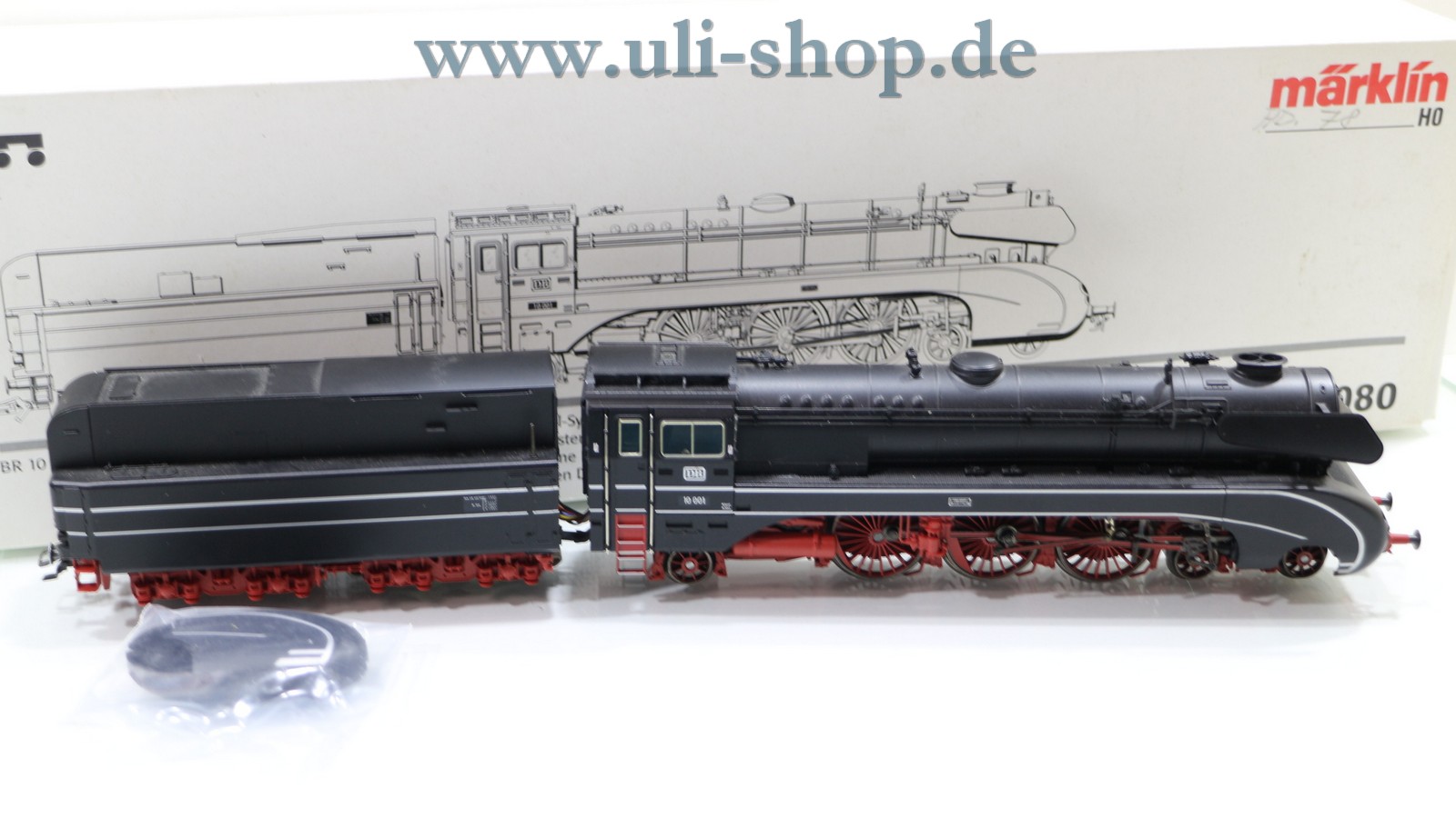Märklin H0 Dampflok mit der Artikelnummer 34080 Stromlinienlok Br. 10 001 der DB. Der Artikel ist für den Betrieb mit Wechselstrom vorgesehen. Die Lok ist mit einem Delta-Modul ausgestattet und kann auch auf analogen und digital gesteuerten Anlagen fahren. Die Originalverpackung ist vorhanden.
