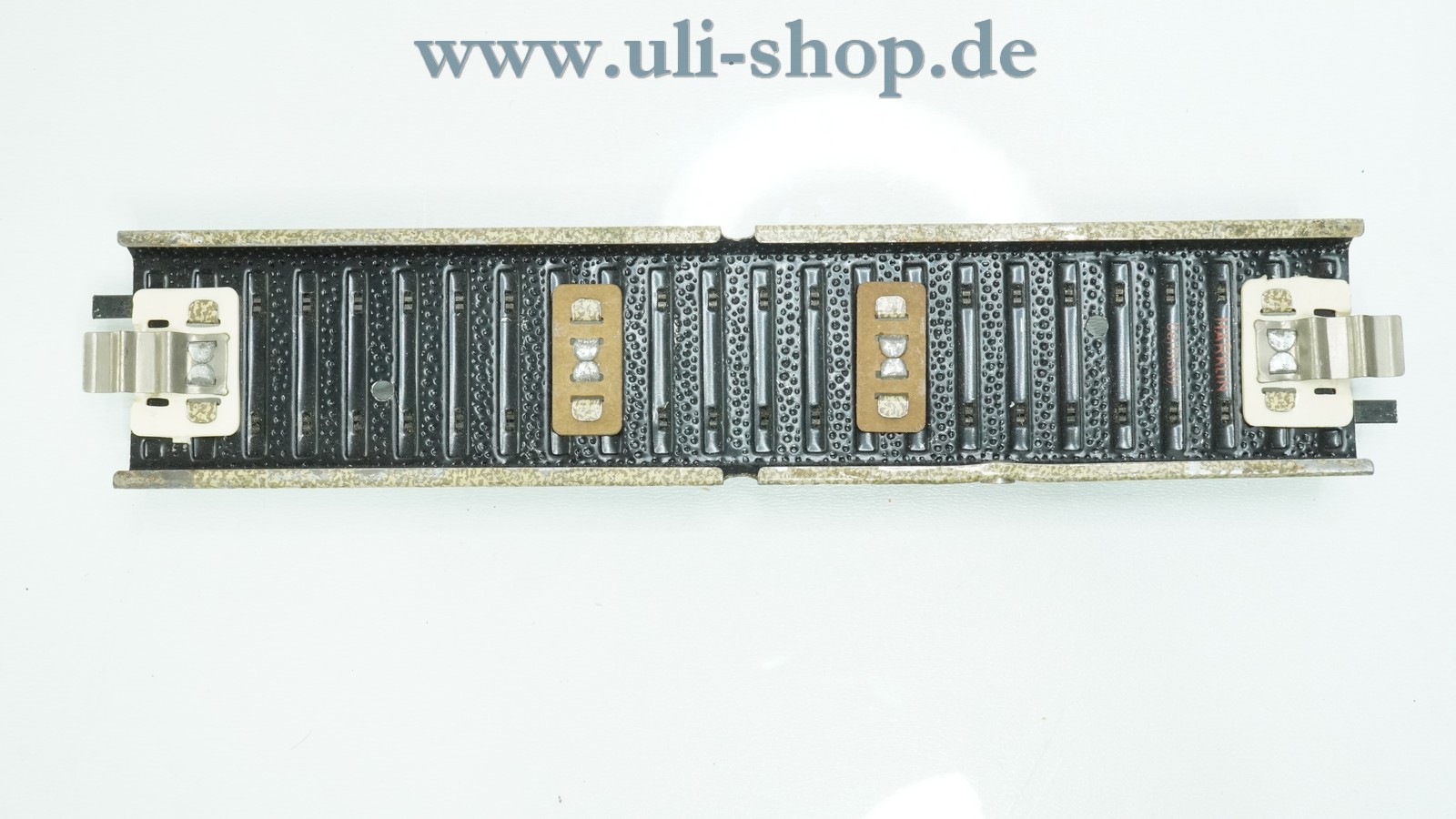 Den optischen Zustand würden wir als bespielt/gebraucht mit normalen Gebrauchsspuren (durch Spielbetrieb) bezeichnen. Das Gleis weist normale Gebrauchsspuren auf. Es können an dem Gleis kleinere Kratzer, kleinere Farb- und Kleb-Reste sowie etwas Rost vorhanden sein.