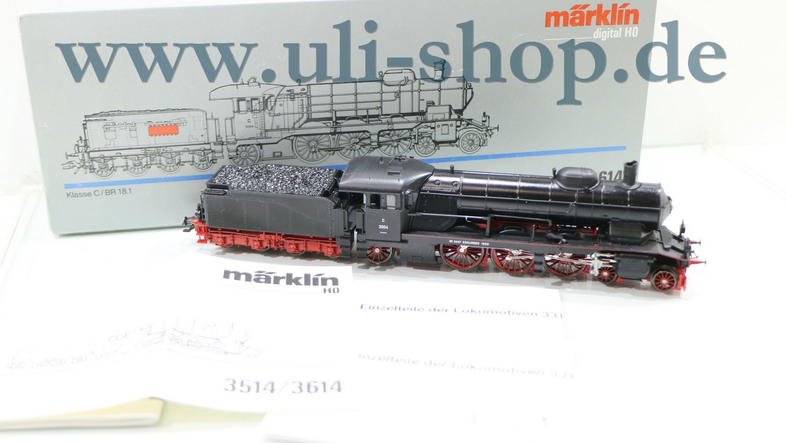 Märklin H0 Dampflok mit der Artikelnummer 3614 Klasse C 2004 der K.W.St.E. Der Artikel ist für den Betrieb mit Wechselstrom vorgesehen. Die Lok ist mit einem Digital-Decoder ausgestattet. Die Originalverpackung ist vorhanden. Bei der Lok fehlen die Lokführerfigur und die Heizerfigur.