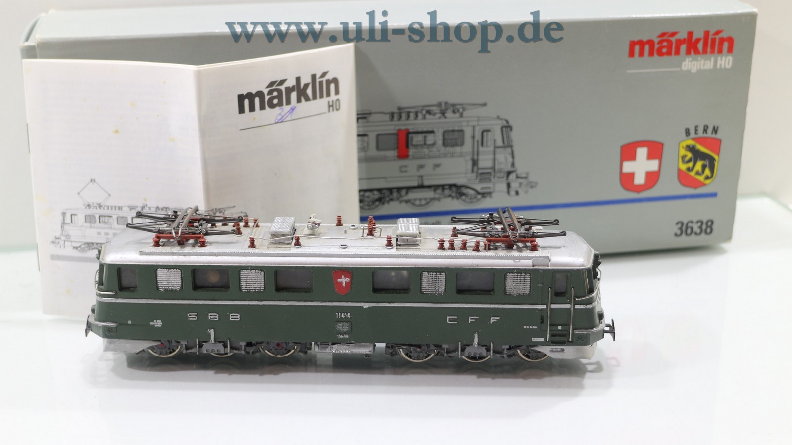 Märklin H0 E-Lok mit der Artikelnummer 3638 Serie Ae 6/6 11414 der SBB CFF. Der Artikel ist für den Betrieb mit Wechselstrom vorgesehen. Die Lok ist mit einem Digital-Decoder ausgestattet. Die Originalverpackung ist vorhanden.