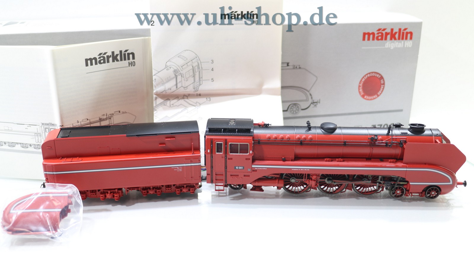 Märklin H0 Dampflok mit der Artikelnummer 37082 Br. 10 001 rot Sondermodell 10 Jahre Insider. Der Artikel ist für den Betrieb mit Wechselstrom vorgesehen. Die Lok ist mit einem Digital-Decoder ausgestattet und verfügt über Sound. Die Originalverpackung ist vorhanden. Die Betriebsanleitung fehlt.