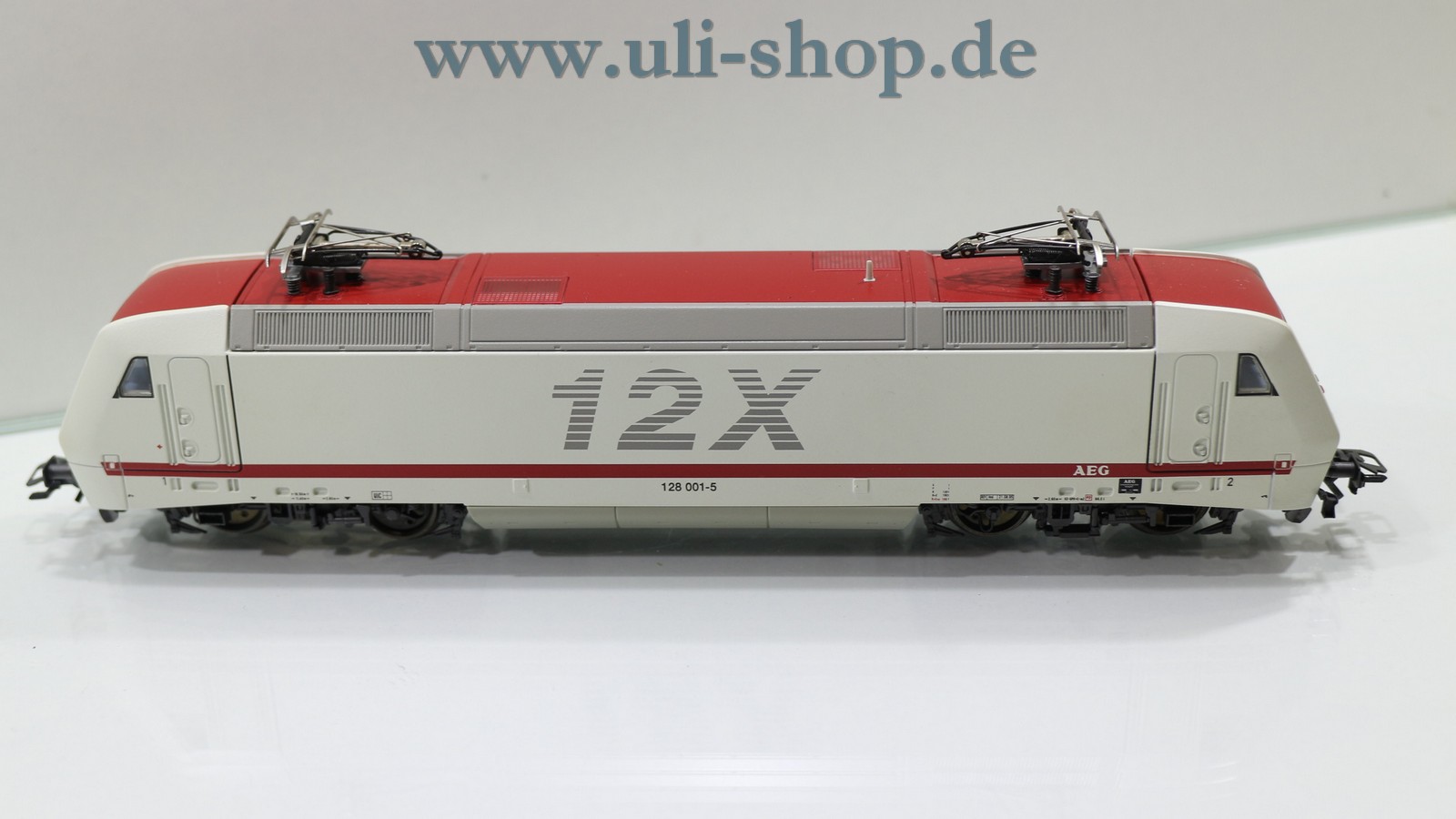 Märklin H0 E-Lok mit der Artikelnummer 3738 Br. 128 001-5 der DB "12X". Der Artikel ist für den Betrieb mit Wechselstrom vorgesehen. Die Lok ist mit einem Digital-Decoder ausgestattet. Die Originalverpackung ist vorhanden. Das Fahr und Rücklicht (Fahrtrichtungsabhängiger Wechsel Rot/weiß) ist im Digitalbetrieb konstant an, Fernlicht am Steuerstand 2 kann digital eingeschaltet werden.