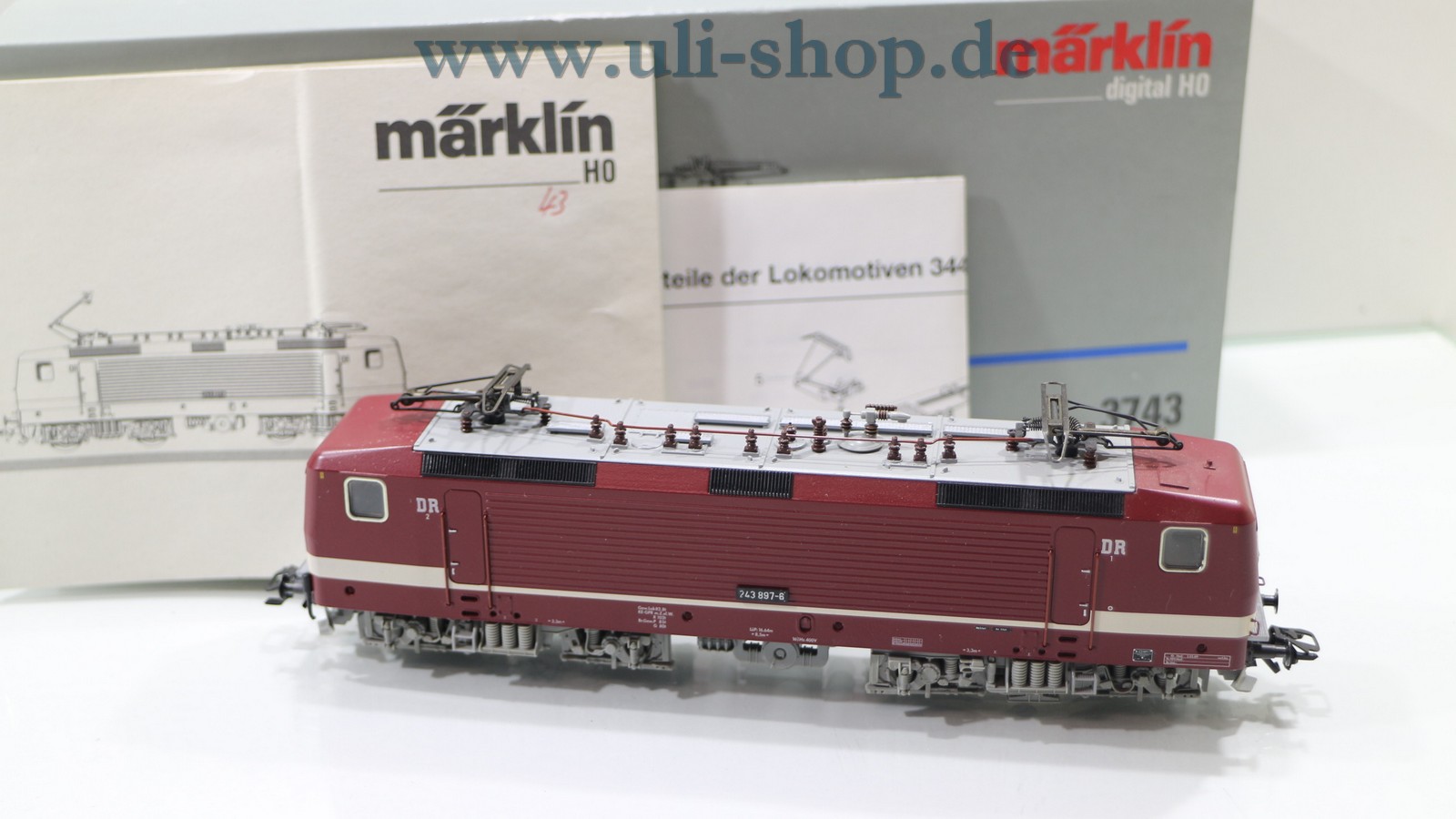 Märklin H0 E-Lok mit der Artikelnummer 3743 Br. 243 897-6 der DR. Der Artikel ist für den Betrieb mit Wechselstrom vorgesehen. Die Lok ist mit einem Digital-Decoder ausgestattet. Die Originalverpackung ist vorhanden.